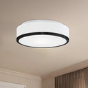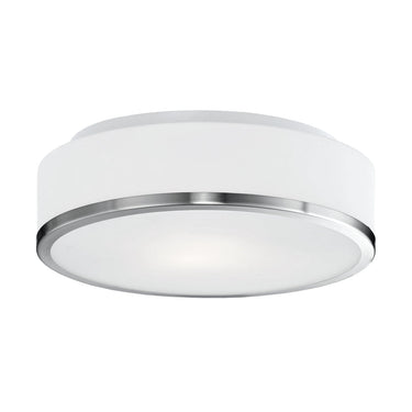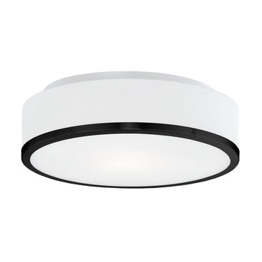 Two lamp flush mount ceiling fixture with white round opal glass and your choice of brushed nickel or black metal finished trim.