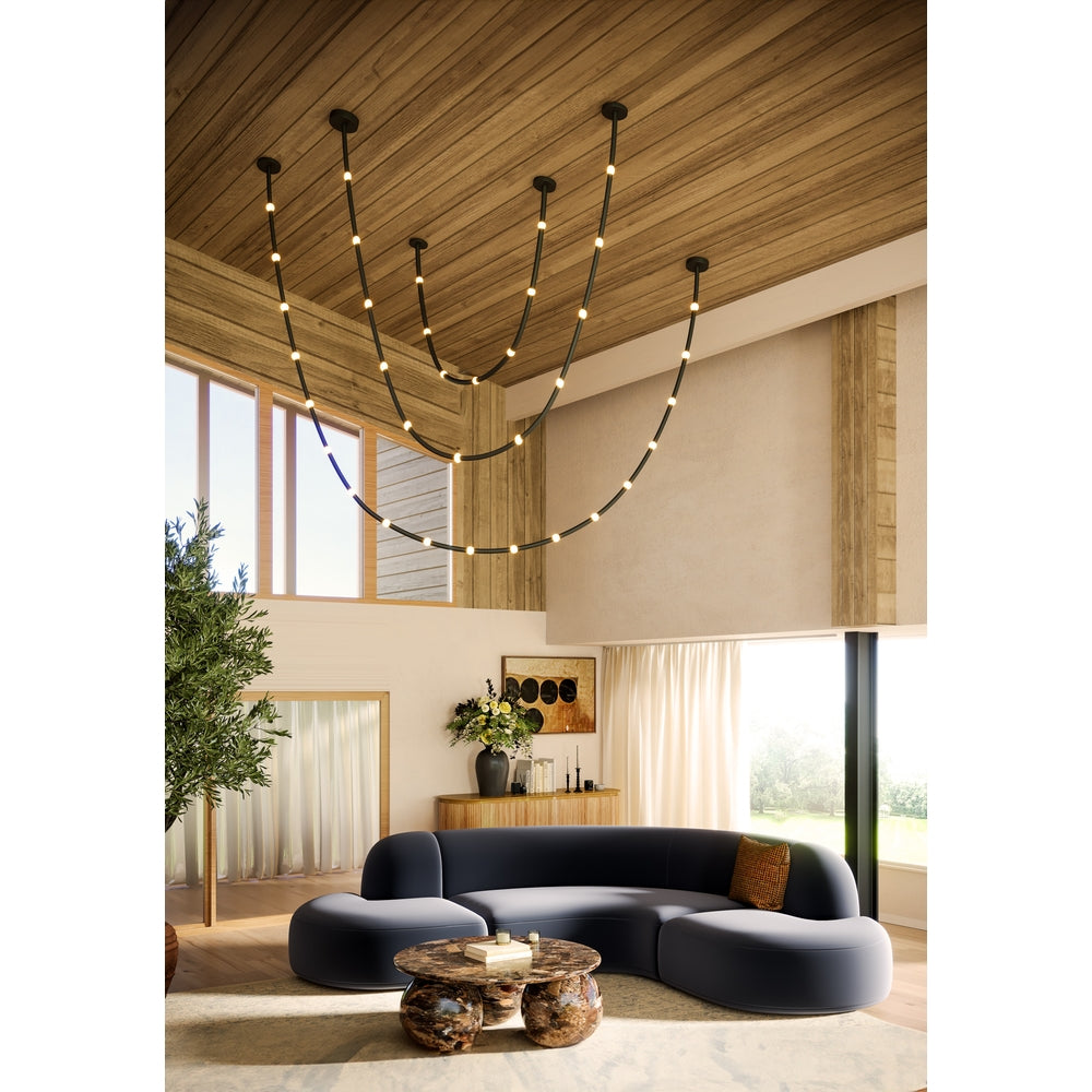 The Corda collection by Branch Creative redefines modern lighting with its adjustable fabric rope adorned with illuminated petite opal glass globes. Perfect for layering in various sizes, it transforms into an eye-catching chandelier suited to any space. Offered with standard junction box covers or remote driver options, Corda delivers versatility and a strikingly unique aesthetic.