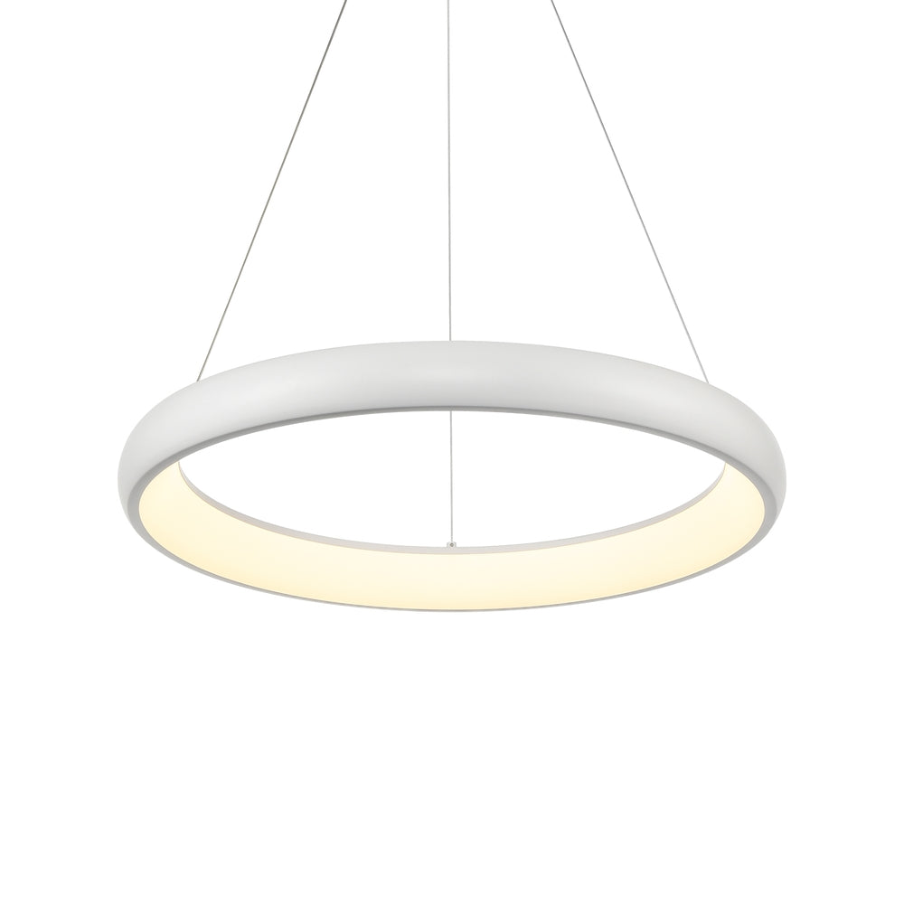 A curved band of powder-coated aluminum arcs around a central void forming and encapsulating an illuminated ring. Held within the perimeter structure of the CORTANA pendant is a circumferential LED light array spreading uniform radiance via the polymeric diffuser loop. Available in multiple sizes.