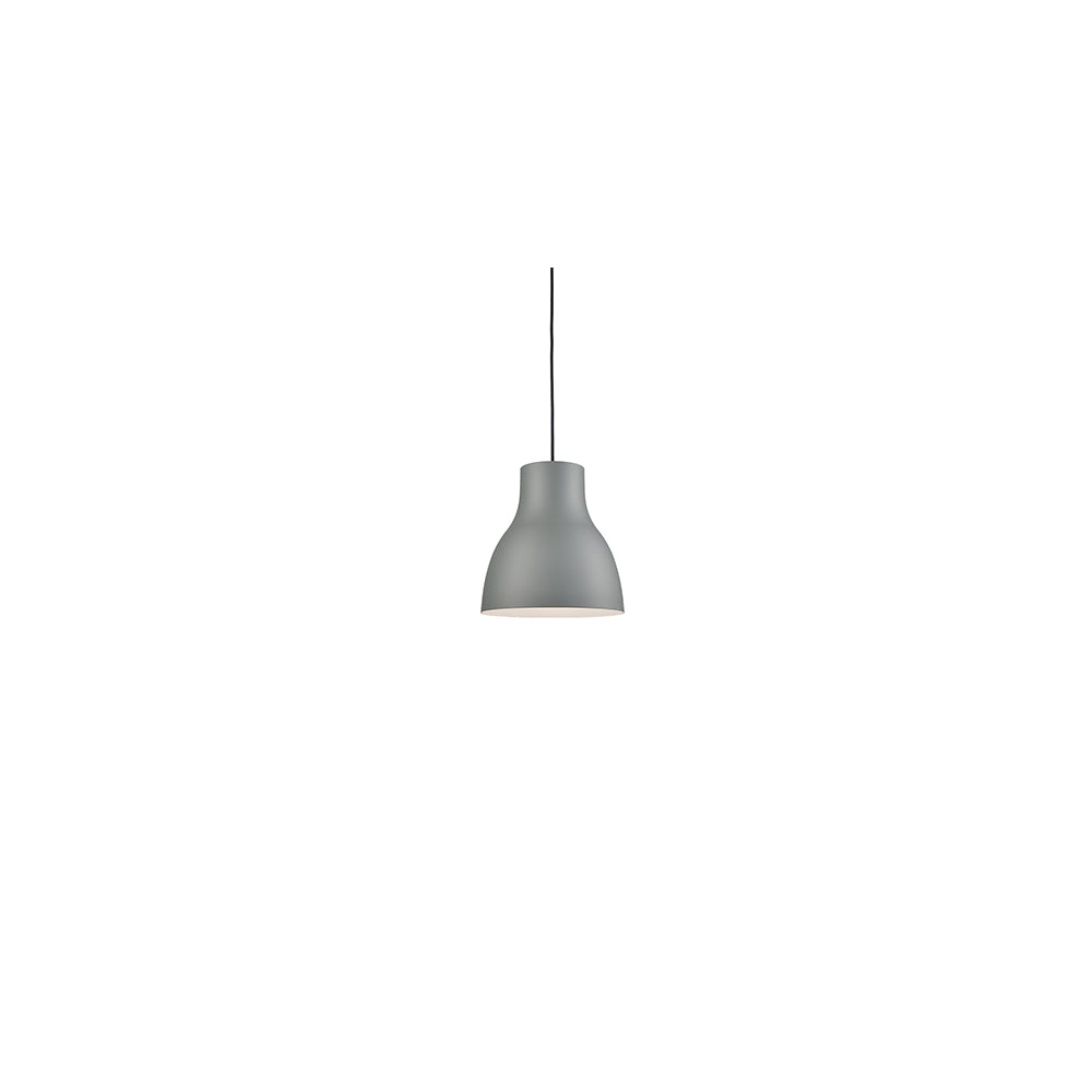 Single-lamp pendant with tapered aluminum shade showcasing powder-coated finishes. Exterior shade colors are either black, gray or white, with matte white interior. Suspended by cloth cable . Available in three sizes.