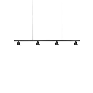 Multiple aluminum cones are connected inline and direct light downwards from the geometric linear pendant. The Dune series utilizes classic minimalist lamp shapes yet in reduced scale to elegant effect. The LED spot sources are focused by diminutive reflectors housed within the exquisitely turned shades. Available in multiple configurations and finishes.