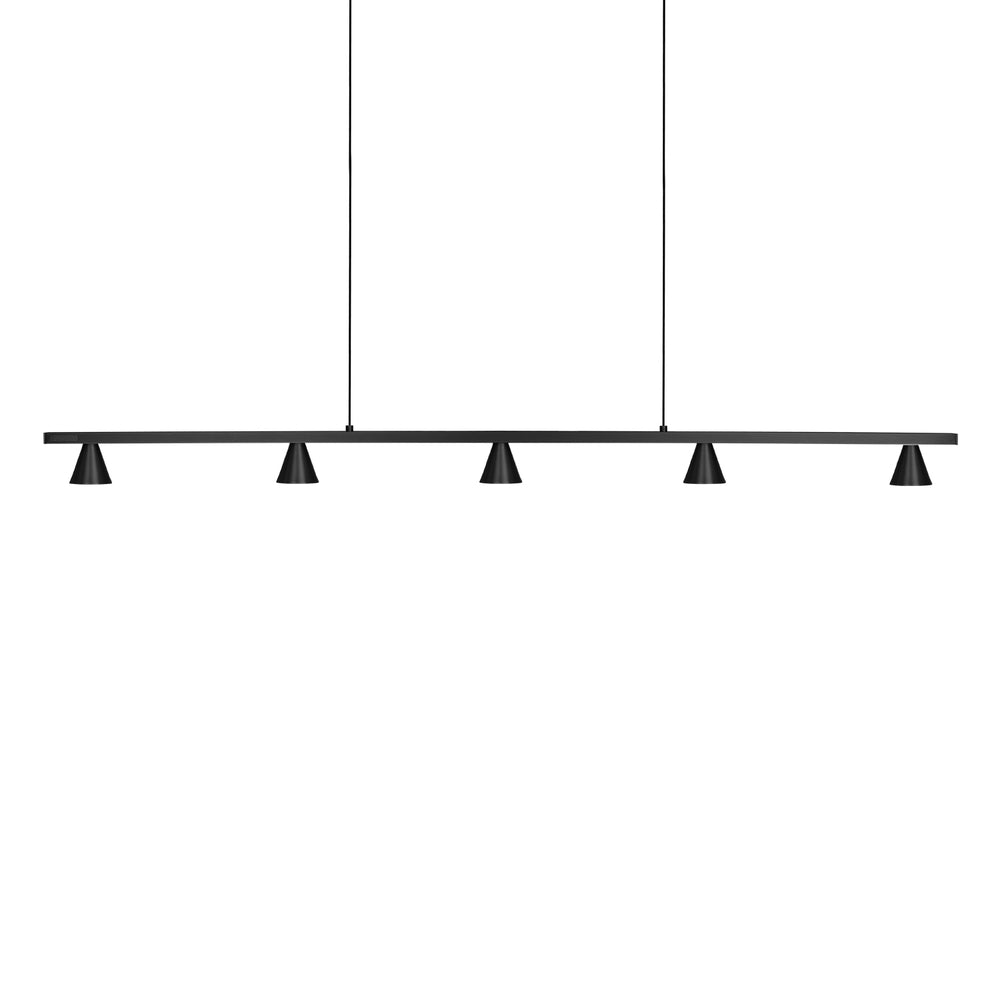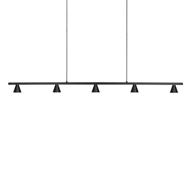 Multiple aluminum cones are connected inline and direct light downwards from the geometric linear pendant. The Dune series utilizes classic minimalist lamp shapes yet in reduced scale to elegant effect. The LED spot sources are focused by diminutive reflectors housed within the exquisitely turned shades. Available in multiple configurations and finishes.