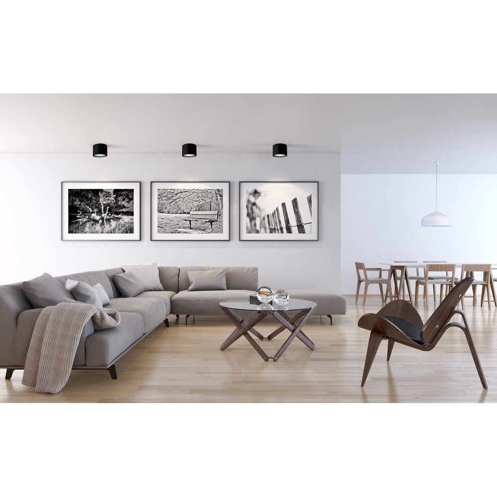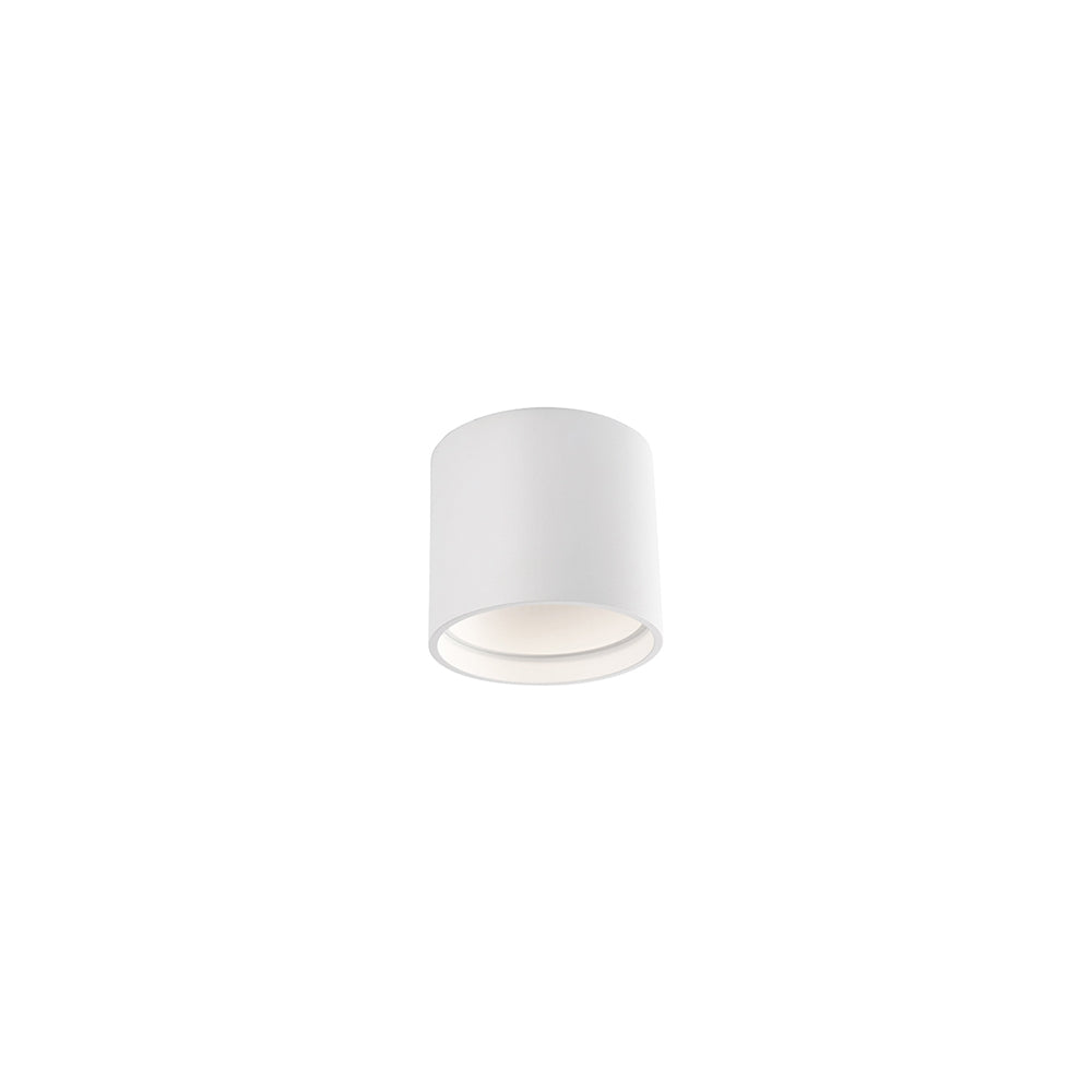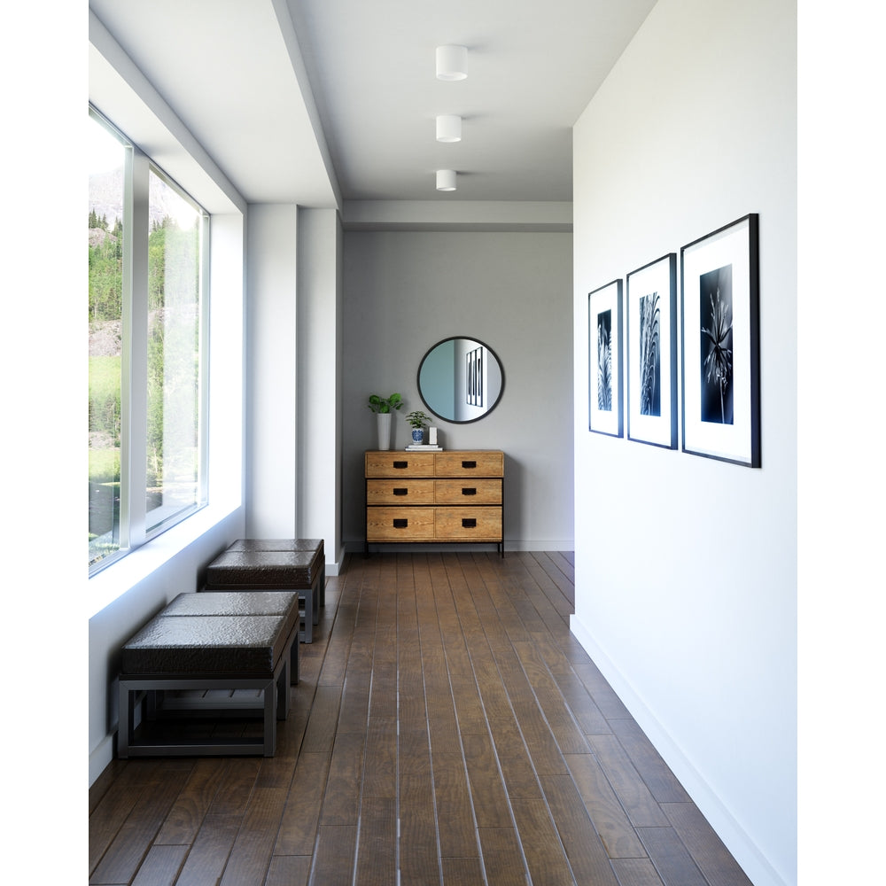 LED flush mount made from heavy gauge cast aluminum painted white or black, round cylinder shaped. Shines through a high-precision optical lens down into the room.