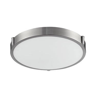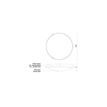Single LED flush mount ceiling fixture with round white opal glass. Metal details in brushed nickel & brushed gold finish, and is equipped with our powerful 120V AC LED technology