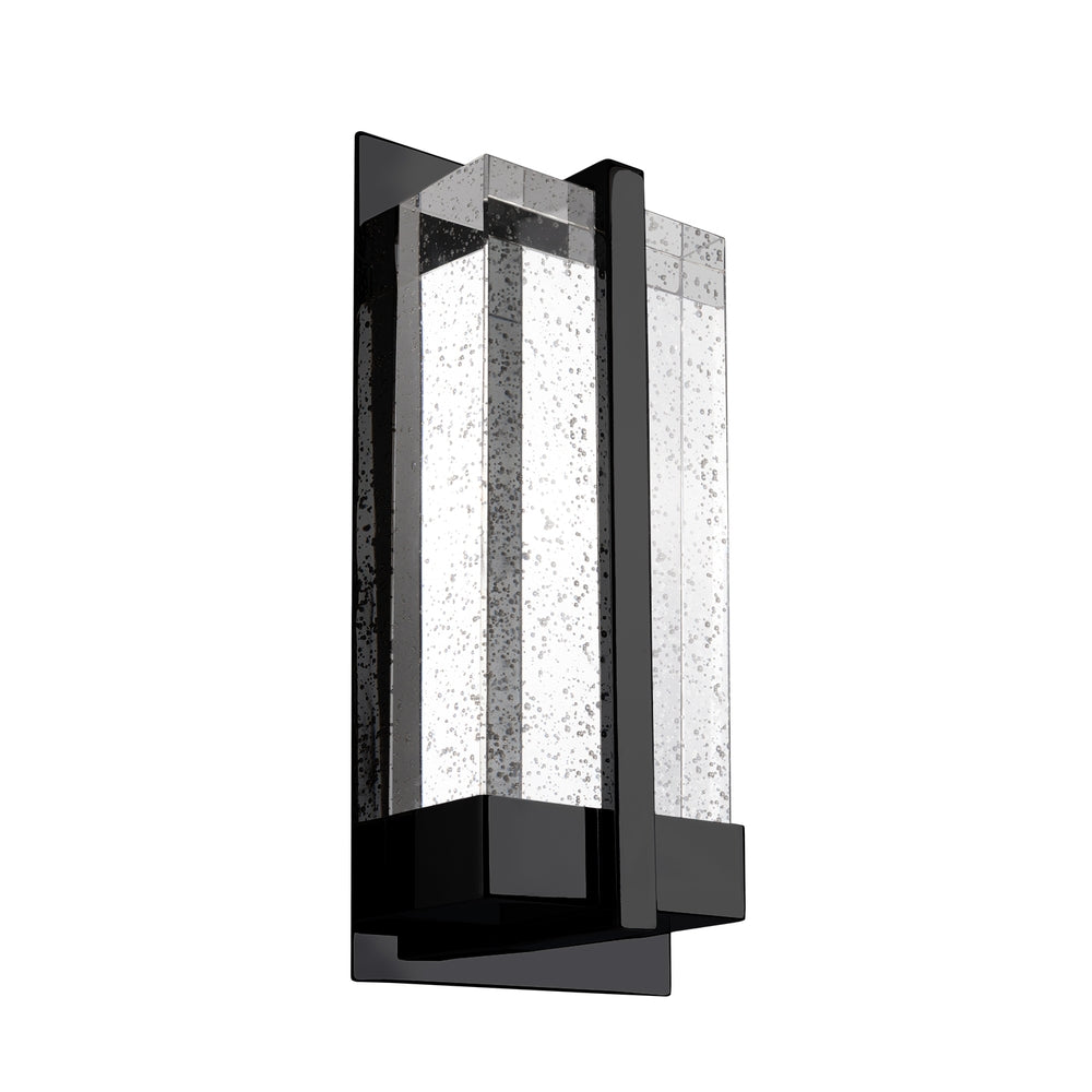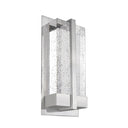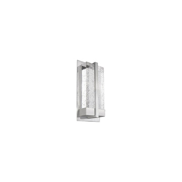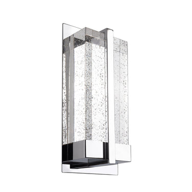 This intensive LED wall sconce is one of a kind. Build with heavy gauged steel, plated in two finishes brushed nickel or polished chrome. With a solid rectangular bubble encased crystals which sits directly above LED board. When lit the crystal expels the light with beautiful patterns on the wall and around the room. Equipped with our powerful 120V AC LED technology