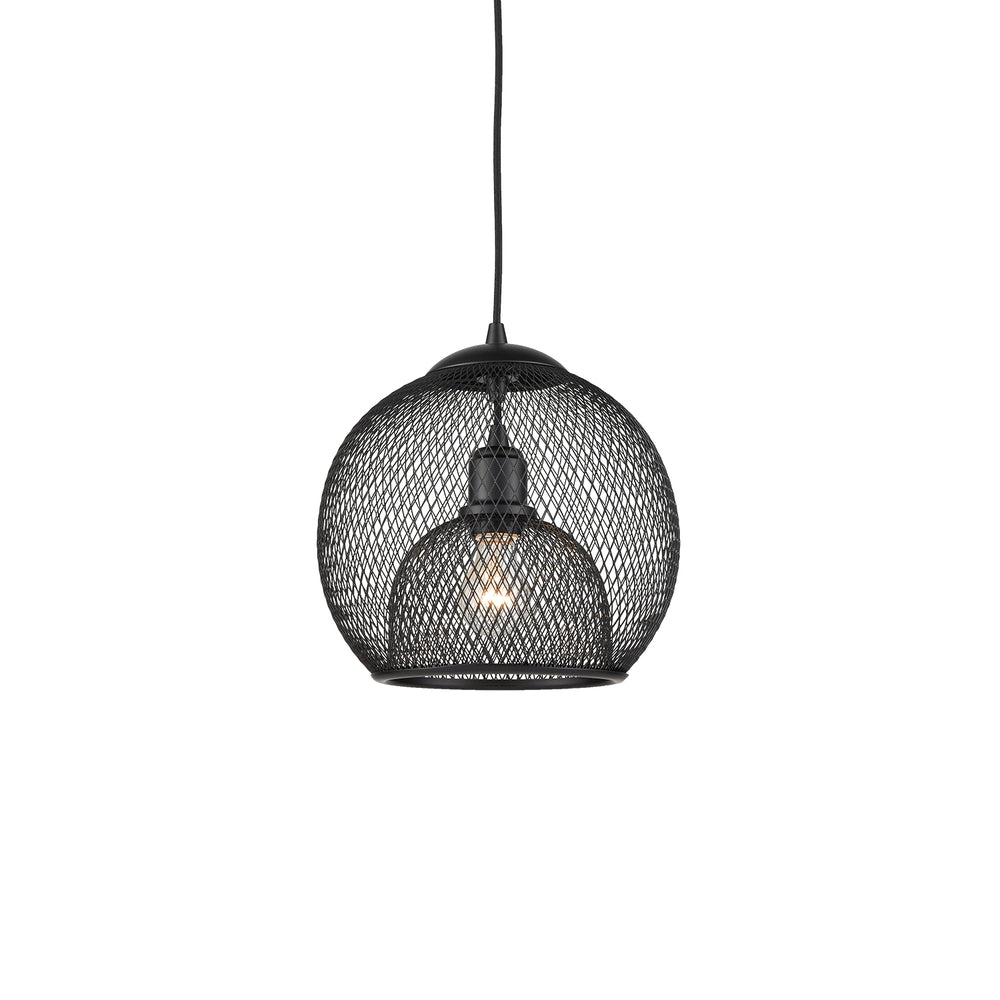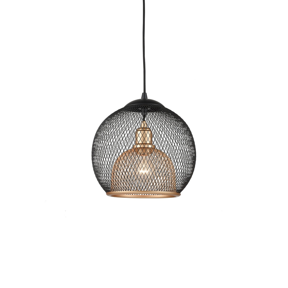 Single lamp pendant with spherical powder-coated wire mesh shade. Color configurations include uniform black or an exterior black mesh with inner gold mesh. Suspended by matching cable. Available in 2 sizes.