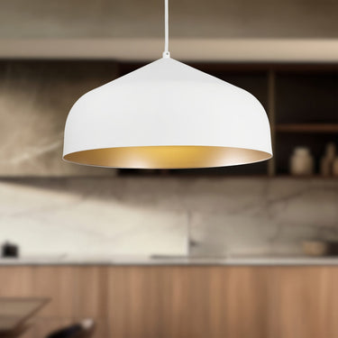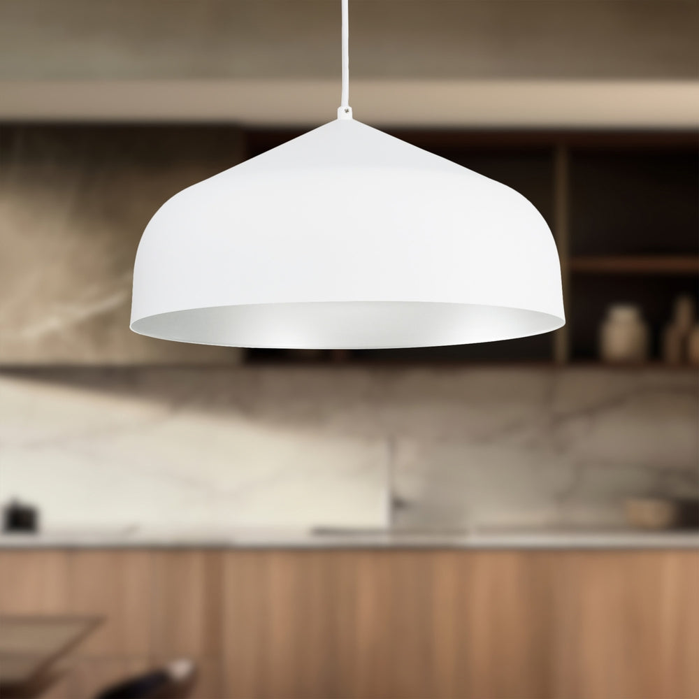 The smooth spun metal shade for this modern pendant can be paired with your choice of multiple interior lamp shade colors and the possibilities are endless. Suspended by a matching braided fabric cord the Helena exudes effortless elegance. The acorn-shaped lamp shade measures 8 inches in diameter. Hang this pendant solo or in multiples for a more dramatic look.