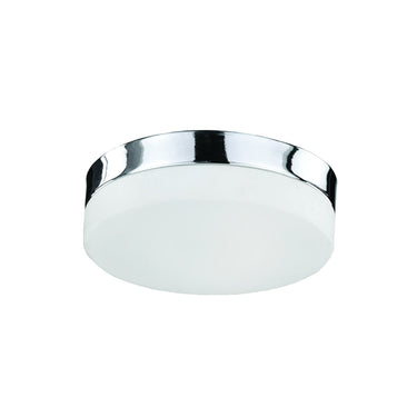 Single LED flush mount ceiling fixture with round white opal glass. Metal details in chrome or brushed nickel finish, and is equipped with our powerful 120V AC LED technology.