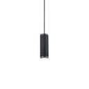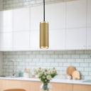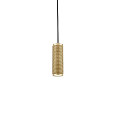 Single lamp pendant with aluminum cylindrical shade embellished by an oversize knurled pattern. Color configurations include black and gold with black interior. Suspended by a black Teflon cable