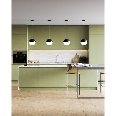 One of our best-selling designs is the retro-style Monae Collection. These decadent orb-shaped lamps are available in a striking black or dazzling brushed gold finish that plays well with modern and retro decor. Available in three different-sized pendants with 120" cables.