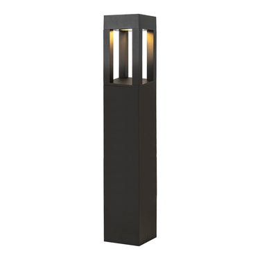 Architectural designed high powered LED exterior bollard fixture, high pressure die-cast aluminum square-shaped housing with four rectangular-shaped openings which radiates the light downward and throughout all openings and surrounding areas of the bollard. Available in two different heights and IK10 Rated.