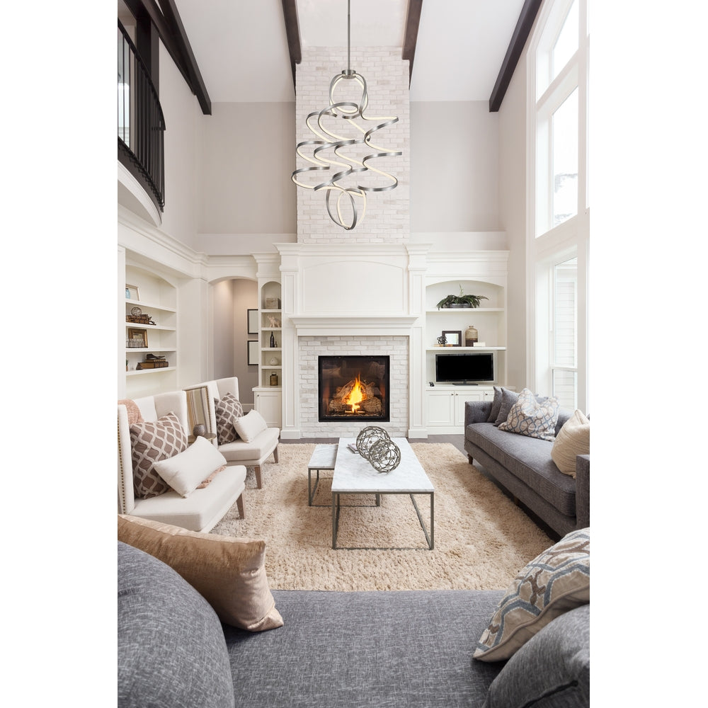 A looping radiant line casts light across space in a continuous helical path. The Synergy series is characterized by the rolled rectangular extrusion, which emits soft light through the silicon opal lens. Configured in both linear and ring arrangements, the arcing aluminum allows the curated finishes to be visible at every angle.