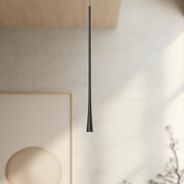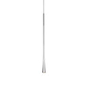 Slightly offset from the suspension cable the die-cast aluminum body repeats linear verticality with an elongated stem that flows into the conical shade. Concealing functionality in an elegant form the X lamp head integrates an LED spot assembly simultaneously serving as heatsink. The exaggerated tubular length provides aesthetic detail while acting as hang straight. Available in several curated finishes.