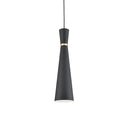 Single-lamp pendant with conical aluminum shade with fine powder-coated finishes and anodized gold ring detail. Exterior shade colors are white or black, with matte white interior. Suspended by cloth cable