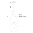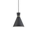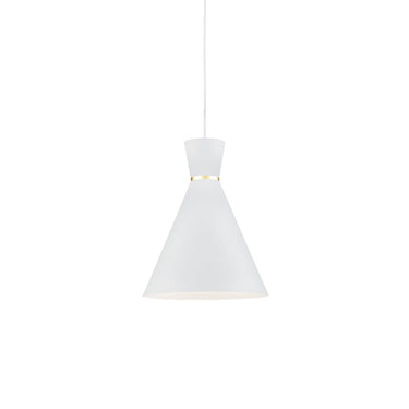 Single-lamp pendant with conical aluminum shade with fine powder-coated finishes and anodized gold ring detail. Exterior shade colors are white or black, with matte white interior. Suspended by cloth cable