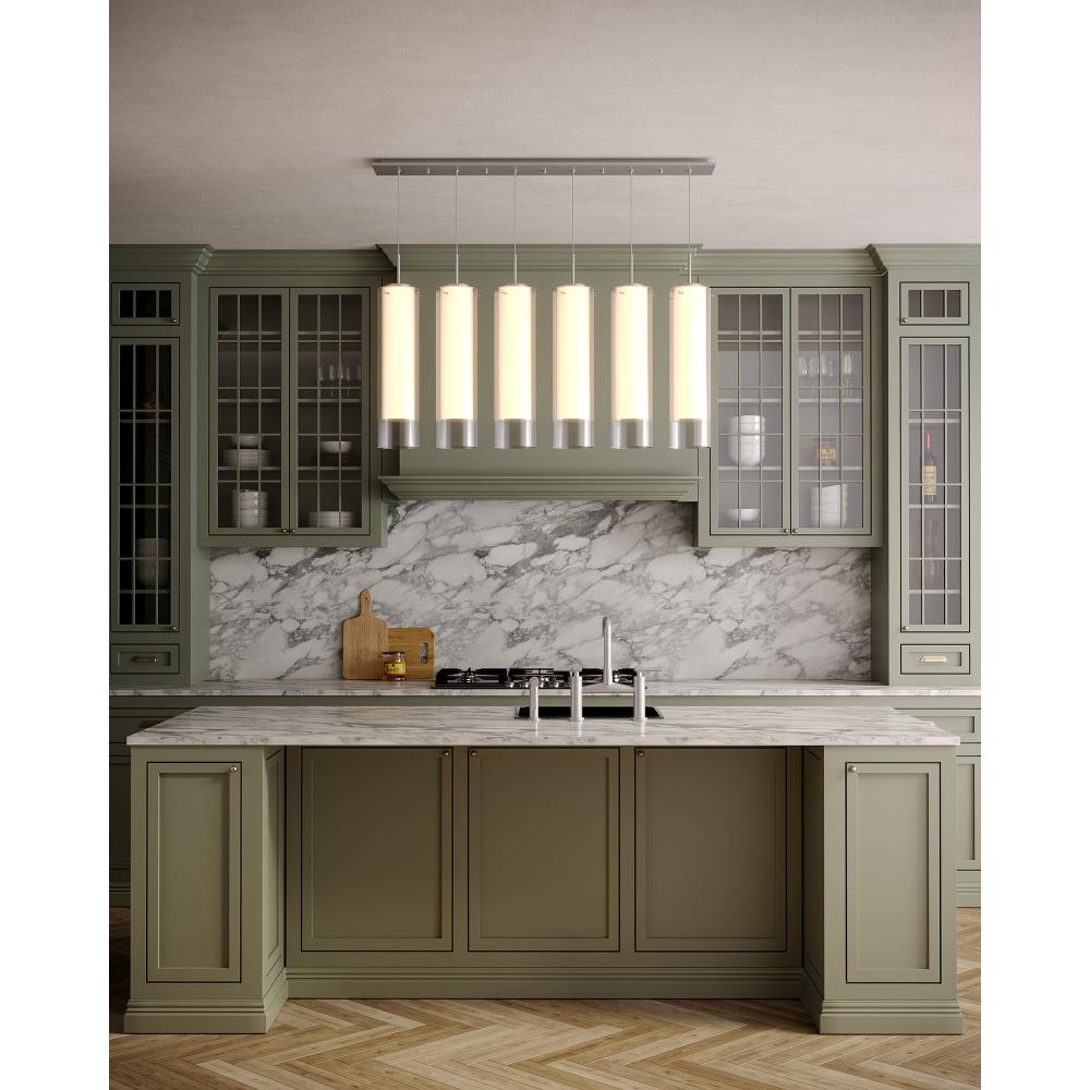 Single LED pendant fixture with cylindrical glass shade plus concentric cylindrical diffuse white inner shade. Minimal clear glass styling plus brush-Nickel finish makes Verona suitable for a host of interior applications. The inner shade removes all glare from the LED source and makes Verona ideal for lighting small dining tables - or use in multiples over larger countertops. Verona uses Kuzco SSL braided cable. Available in two sizes, please view series for more details.