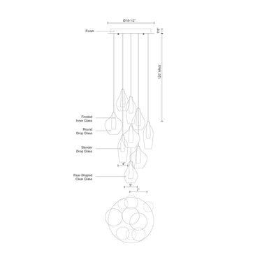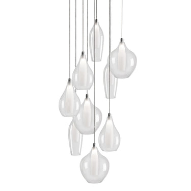 Simplistic elegant round nine multi LED pendant with three styles of clear outer glass and frosted inner glass each set together as one piece (slender drop, pear shaped and round drop glass shades). New patent pending socket design and Kuzco SSL wire allow this fixture to be 12V AC LED. Metal details in chrome finish. Available in three different glass styled single pendants and a variety of multi-pendant options, see series for full details.