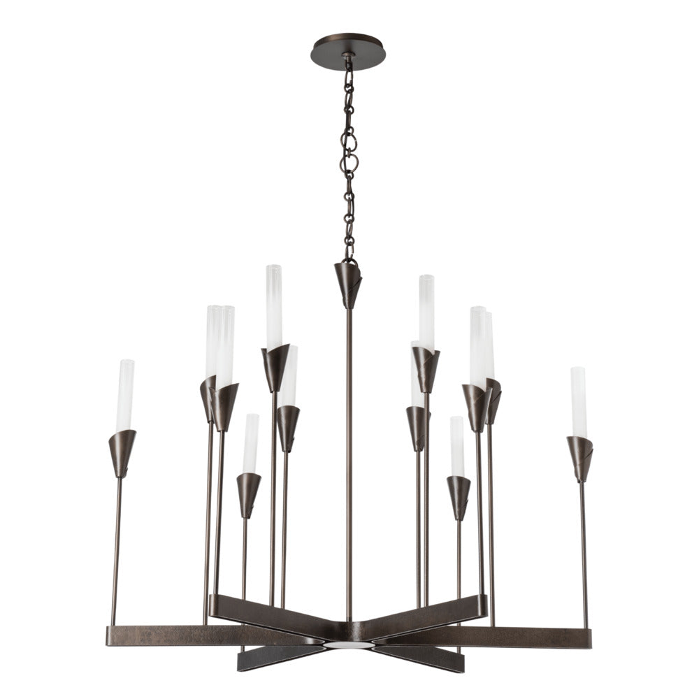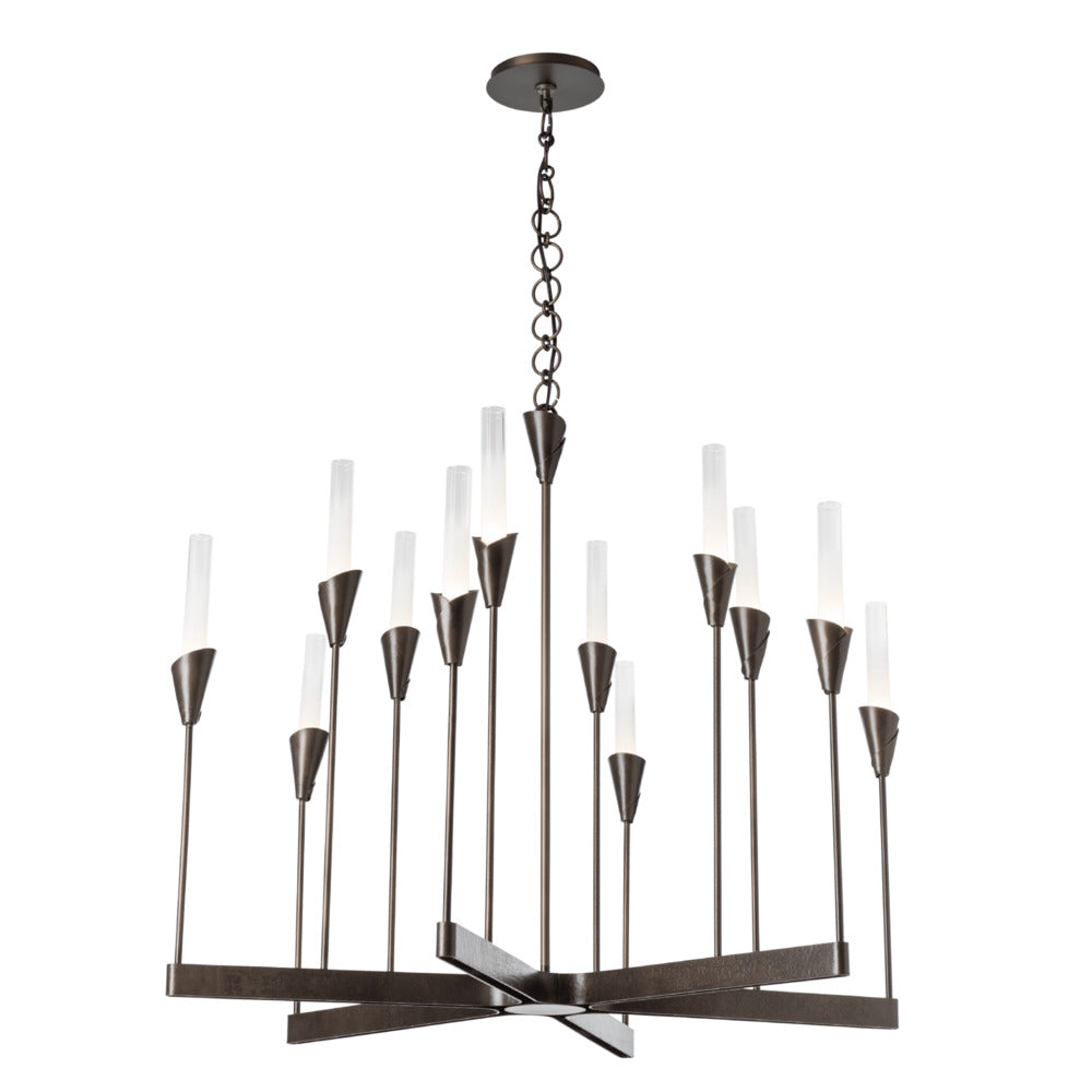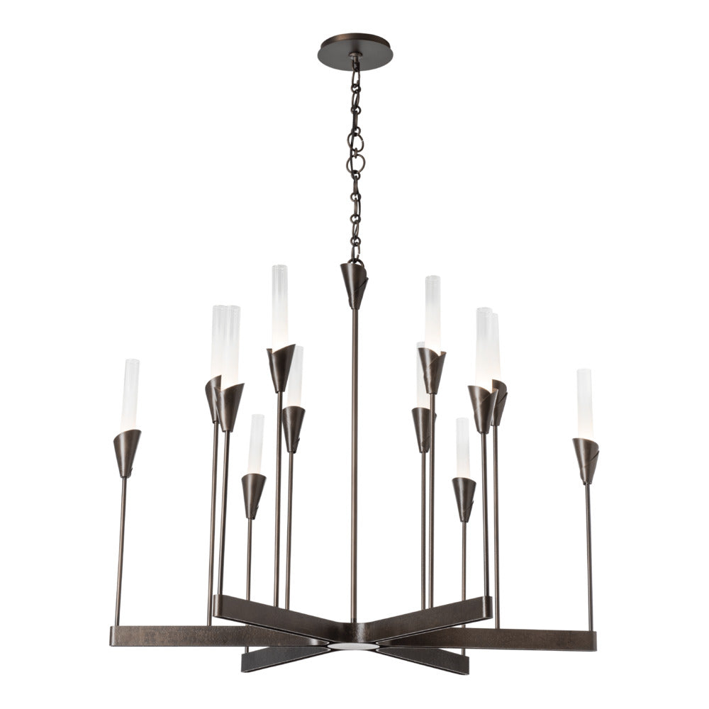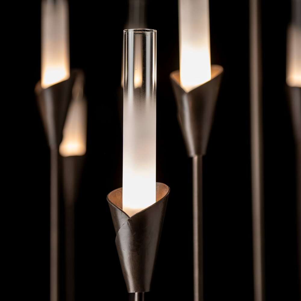 This botanically inspired lighting fixture resembles a field of lilies standing tall. This 12 light, two-tiered chandelier with clean lines features hand-forged tall "cups" that hold vertical gradient-frosted cylindrical glass tubes housing the light within. Paul Marr Hilliard designed the cup's shape to resemble a lily's receptacle, as if giving life to the light.