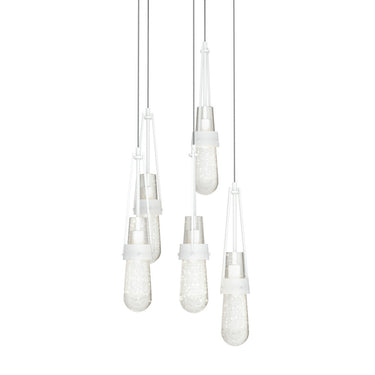The popular Link Collection continues to grow with the Link 5-Light Blown Glass Pendant. This versatile, five-light multi-port is as easily at home as a focal piece creating cascading light, as it is as a unique and dramatic semi-flush, thanks to the enormous adjustability of the Link's cable heights. Beautiful, artisanally blown glass (clear bubble or white threaded) from our Vermont neighbor, adorns this hanging fixture.