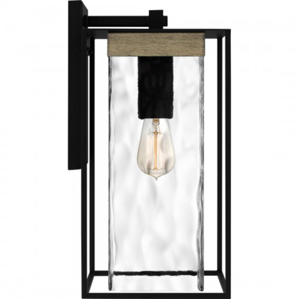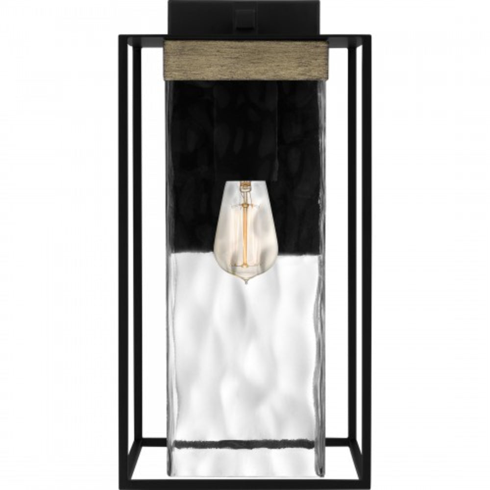 Clear hammered glass adds major visual intrigue in the Longwood lantern collection. This outdoor sconce shines brilliantly with its sturdy rectangular frame, uniquely textured glass shade, and wood accents. A matte black finish completes the look and creates a transitional feel that complements any coastal or farmhouse style homes.