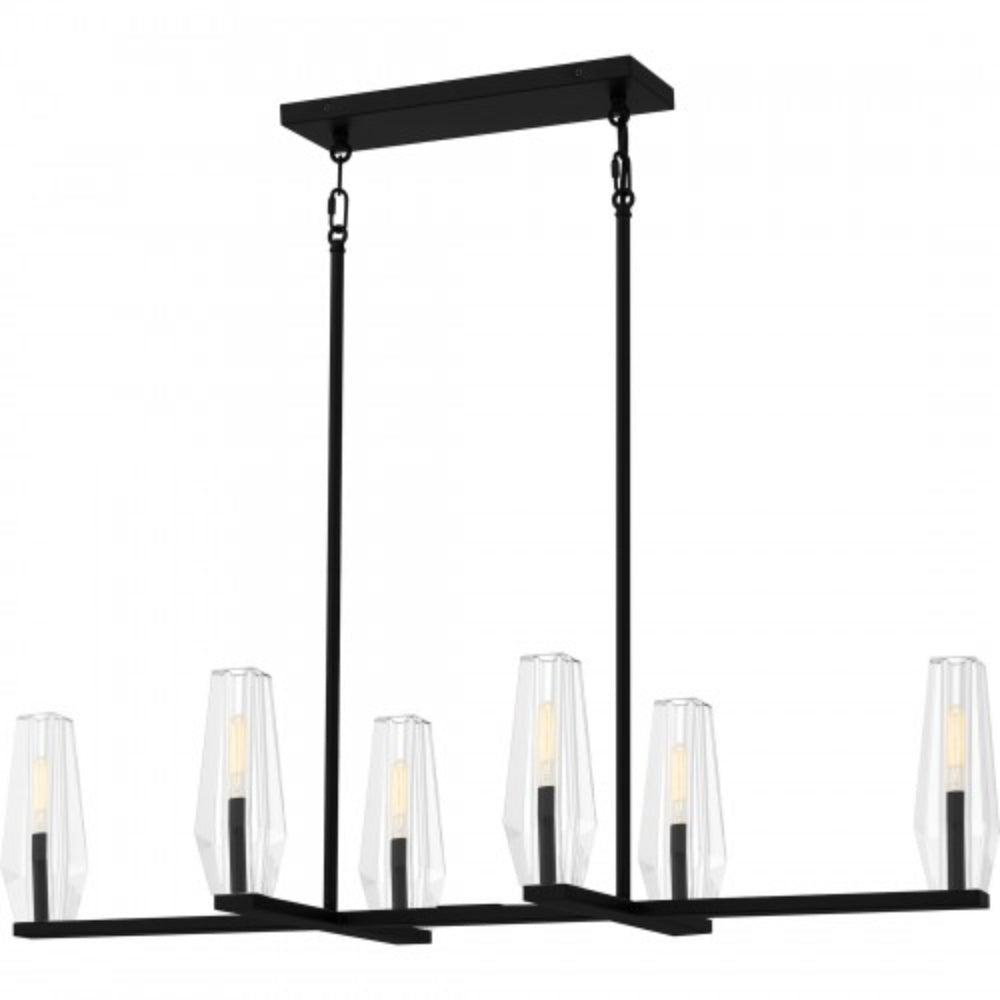 Clear crystal glass shades add elegance and luxury to the Malamute island light. The open linear framework is simple yet sophisticated with a classic matte black finish. Hang the Malamute chandelier over any kitchen island, table, or bar area for a glamorous one-of-a-kind statement piece.