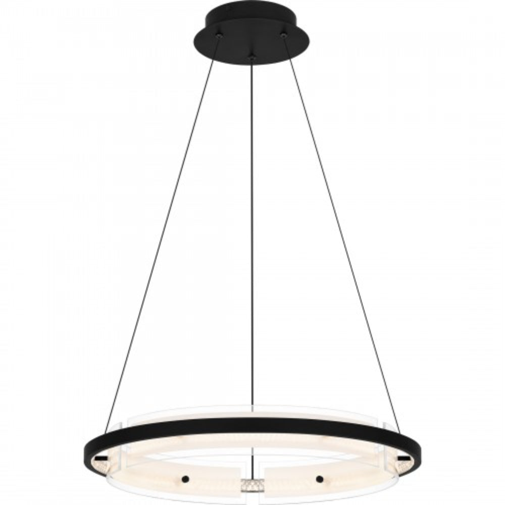 Simple construction and minimal styling elevate the frosted glass detail of Malik. A clean and contemporary ring defines the pendant, featuring a matte black finish for a sharp contrast. An integrated LED light source shines through the clear shade, sparkling brilliantly as it touches each frosted glass accent.