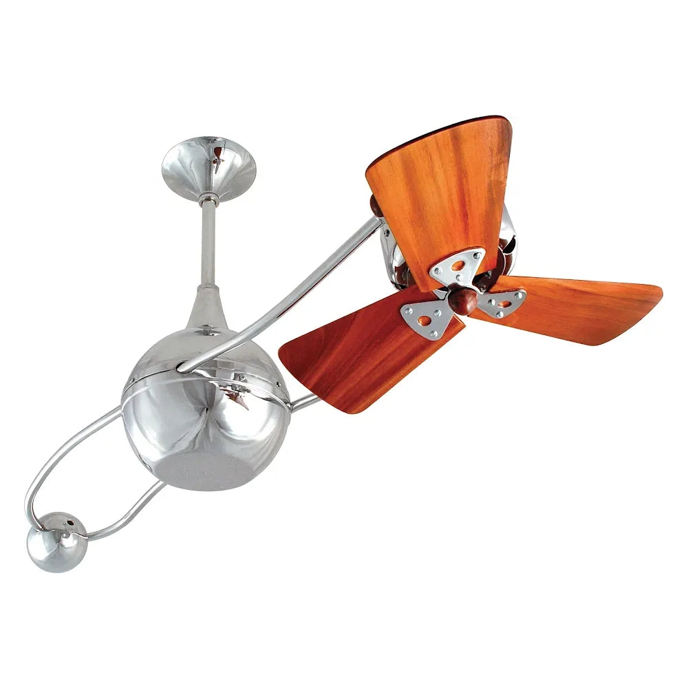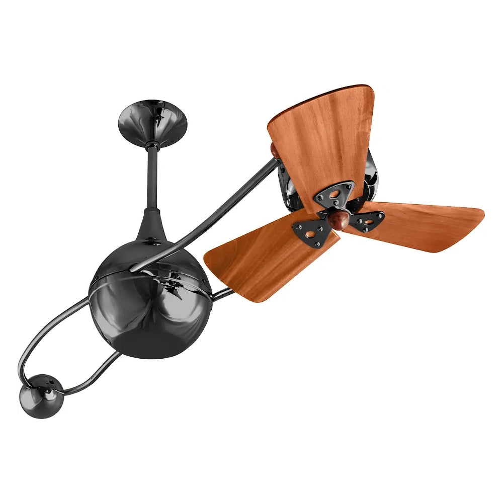 Like satellites orbiting a planet, the Brisa's select mahogany blades and lunar counterweight gently revolve about its spherical gear housing. The fan head can be infinitely positioned in a 180-degree arc for optimum air movement; the greater the angleof the motor to the horizontal support rods (up or down), the faster the axial rotation. A slow, controlled axial rotation is achieved by both fan head position and fan blade speed.