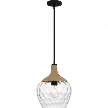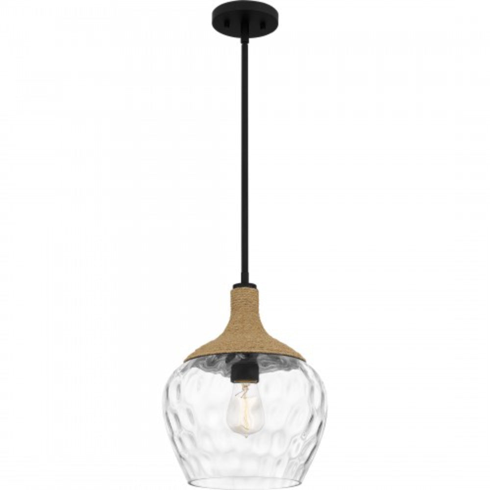 Part of the Quoizel Naturals series, the Royer one-light pendant exemplifies modern bohemian style. Rope detailing surrounding the top of the glass globe shade calls to mind coastal elements. Choose from either clear water glass or opal etched glass - both finished in a handsome matte black.