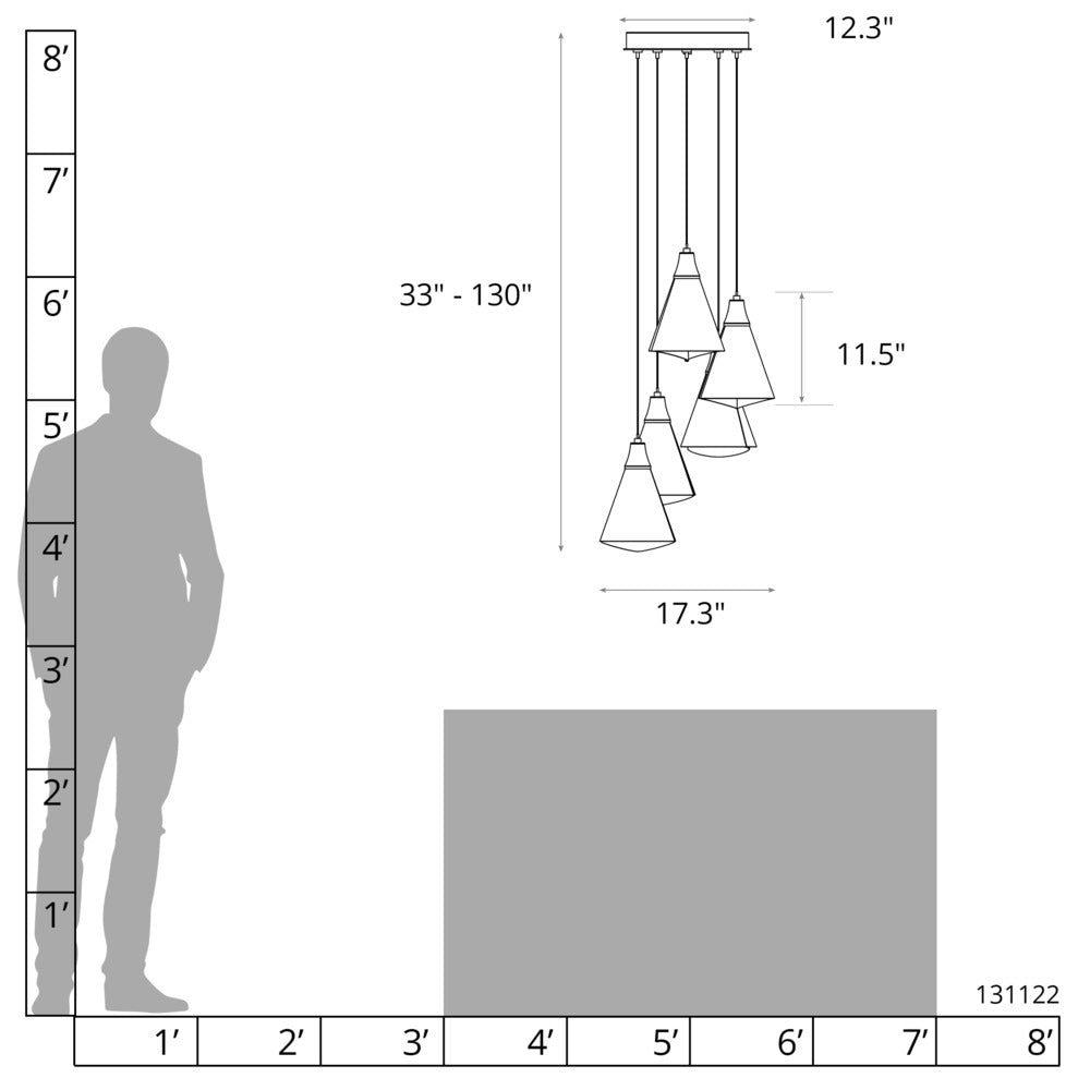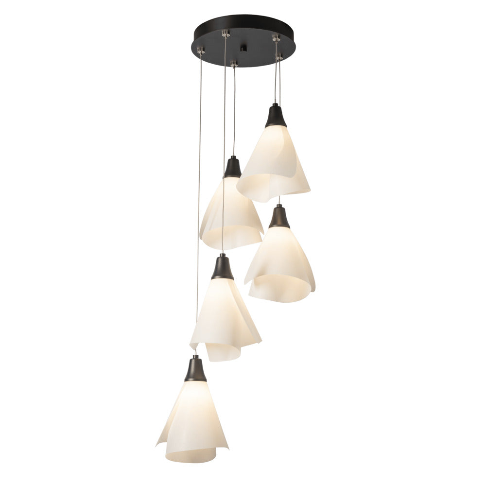 Spun Frost shades are the hallmark of the Mobius Collection, and they're the focus of this Mobius 5-Light Pendant. With an ethereal feel, this multi-port chandelier offers remarkable versatility. Thanks to the large adjustability of its cable heights, the Mobius can easily suit its space as either a pendant or a dramatic semi-flush.