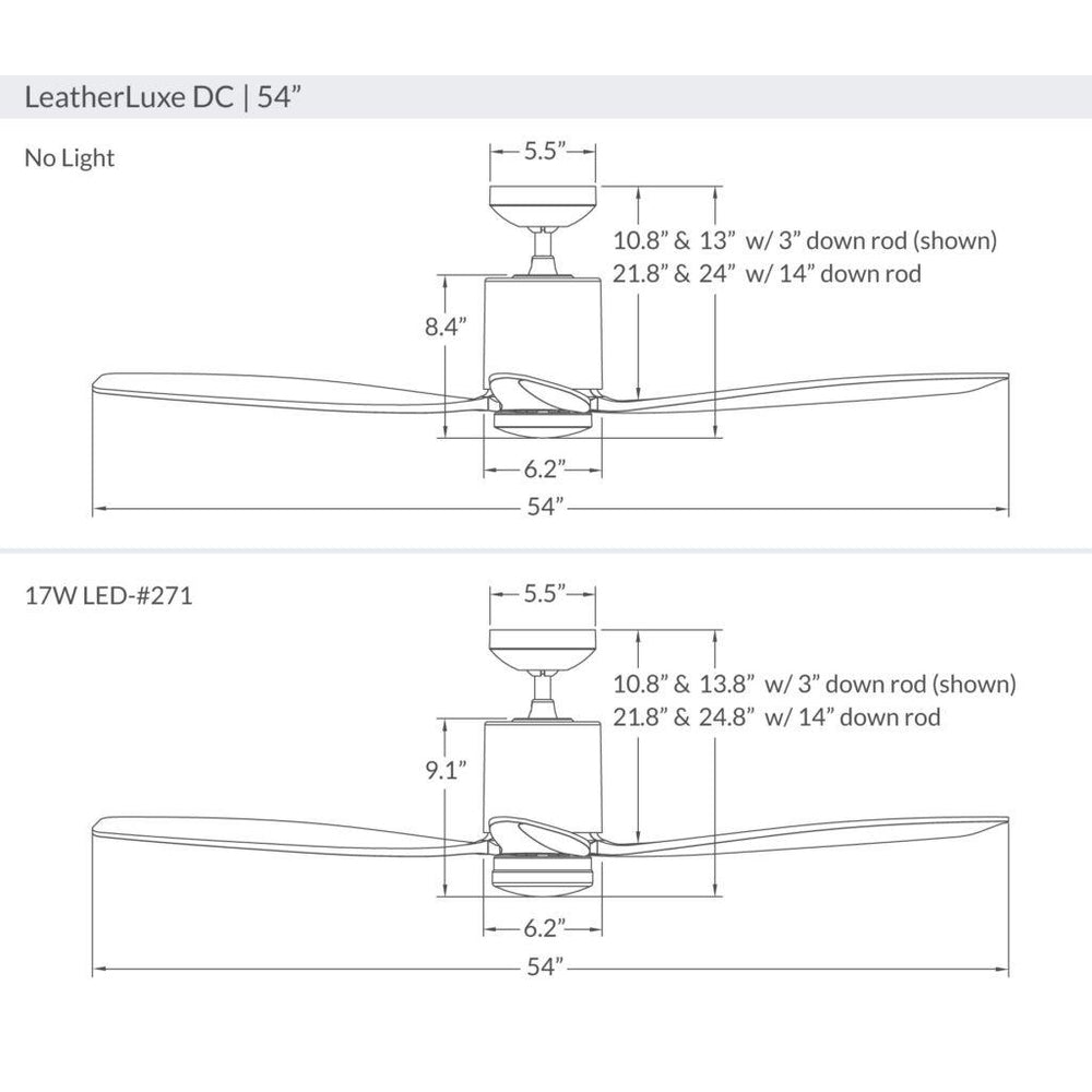 - Optional LED light: 17W, 90 CRI, 3000K, 1530 lumens (dimmable) behind opal glass diffuser; adds 0.75 to length of fan; CA Title 24 (JA8) compliant