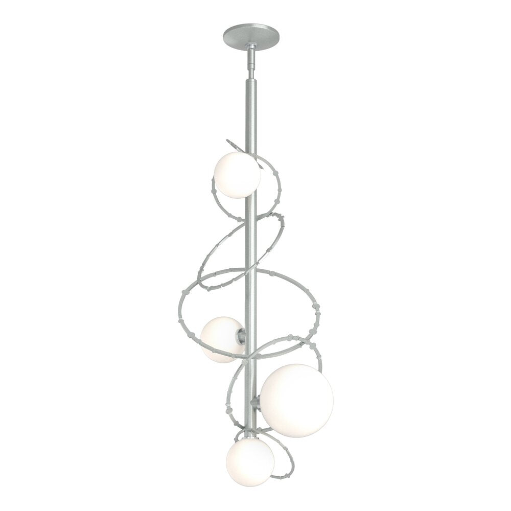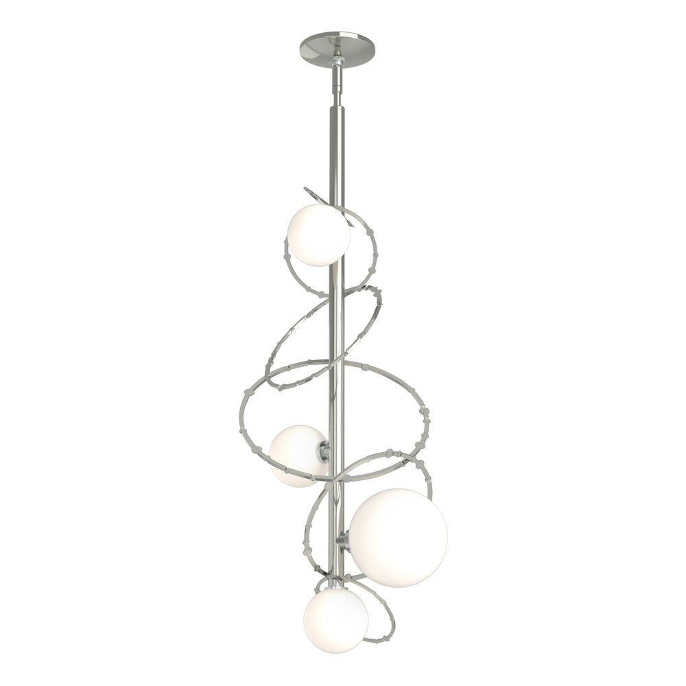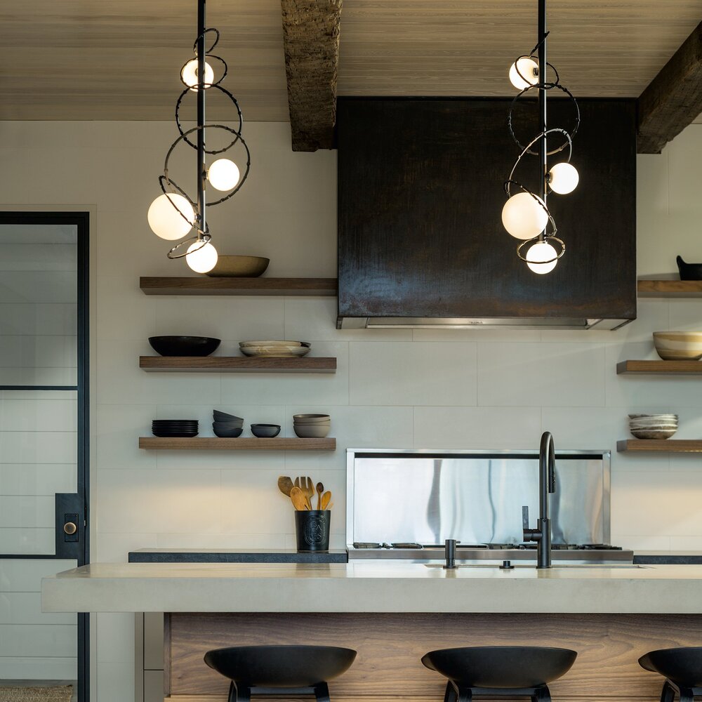 The Olympus Vertical Pendant is part of the 2021 Olympus Collection that includes a grand Orb pendant, wall sconce, two starburst pendants, and a vertical pendant, in addition to this Vertical Pendant. Featuring four glass globes and hand-forged steel rings on a vertical rod, the Olympus Vertical Pendant may be hung singly over a nightstand or vanity, or in multiples over a kitchen island, or any space that requires both light and visual movement.