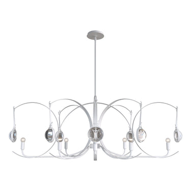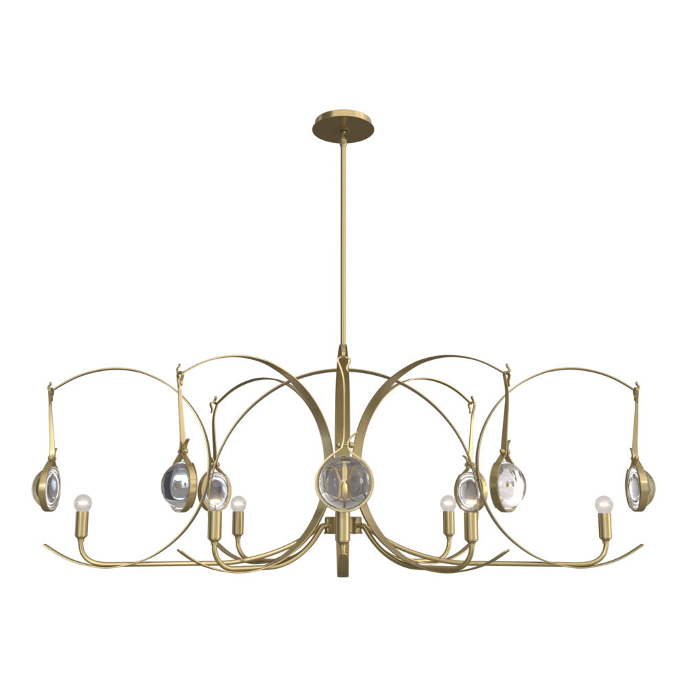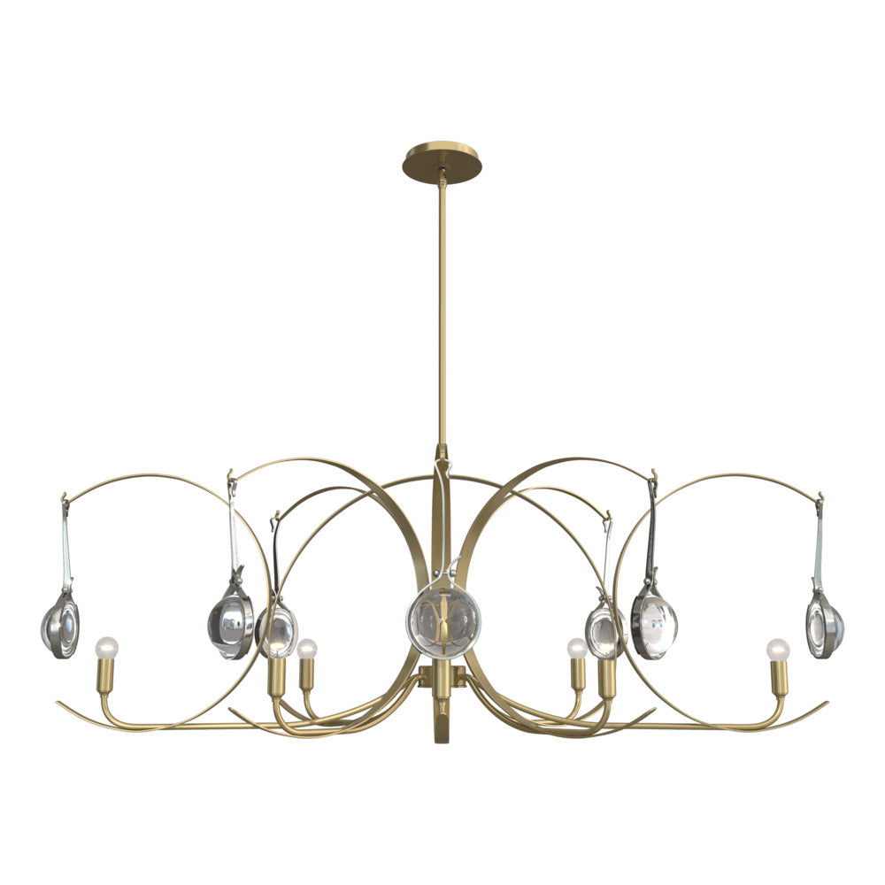 VP of Design, David Kitts, describes the Optic 8-Light Oval Pendant as having been "inspired by the ripples of light and reflections in water, this piece was designed to evoke the same feelings through thick domed glass lens and arced forge steel forms." The eight unique "lens" glass elements are made by a generational family-owned and operated pressed glass business in Ohio.