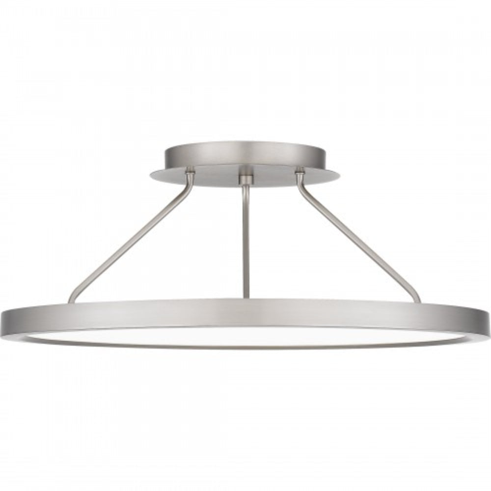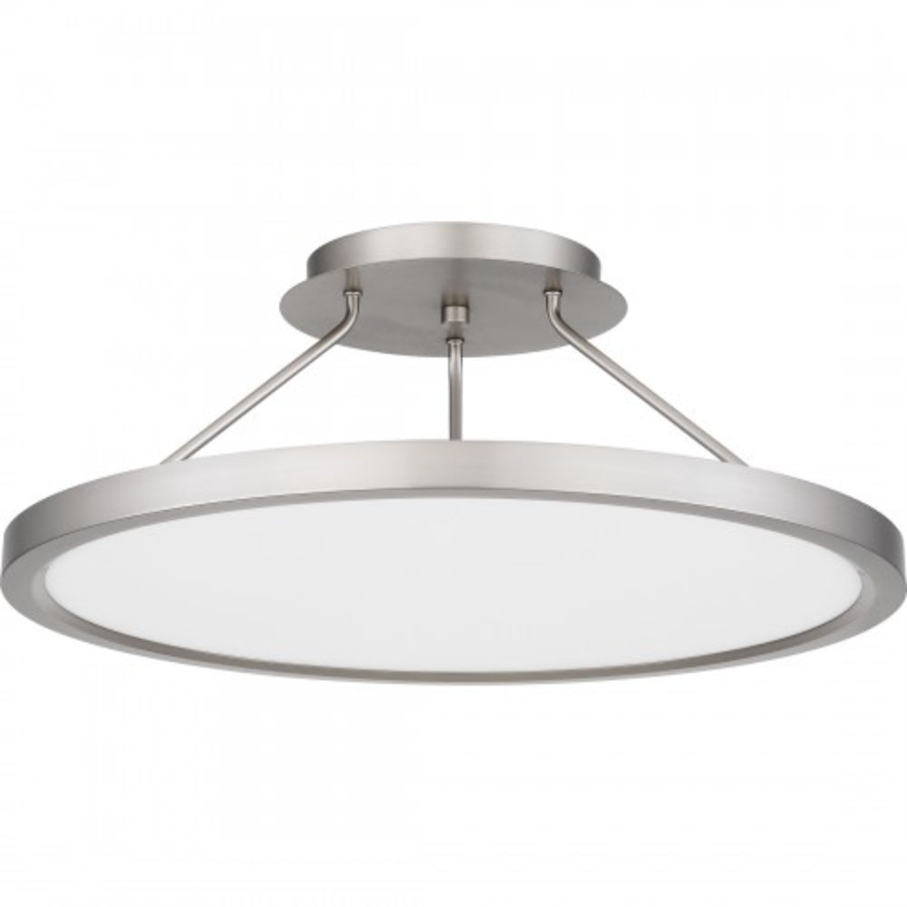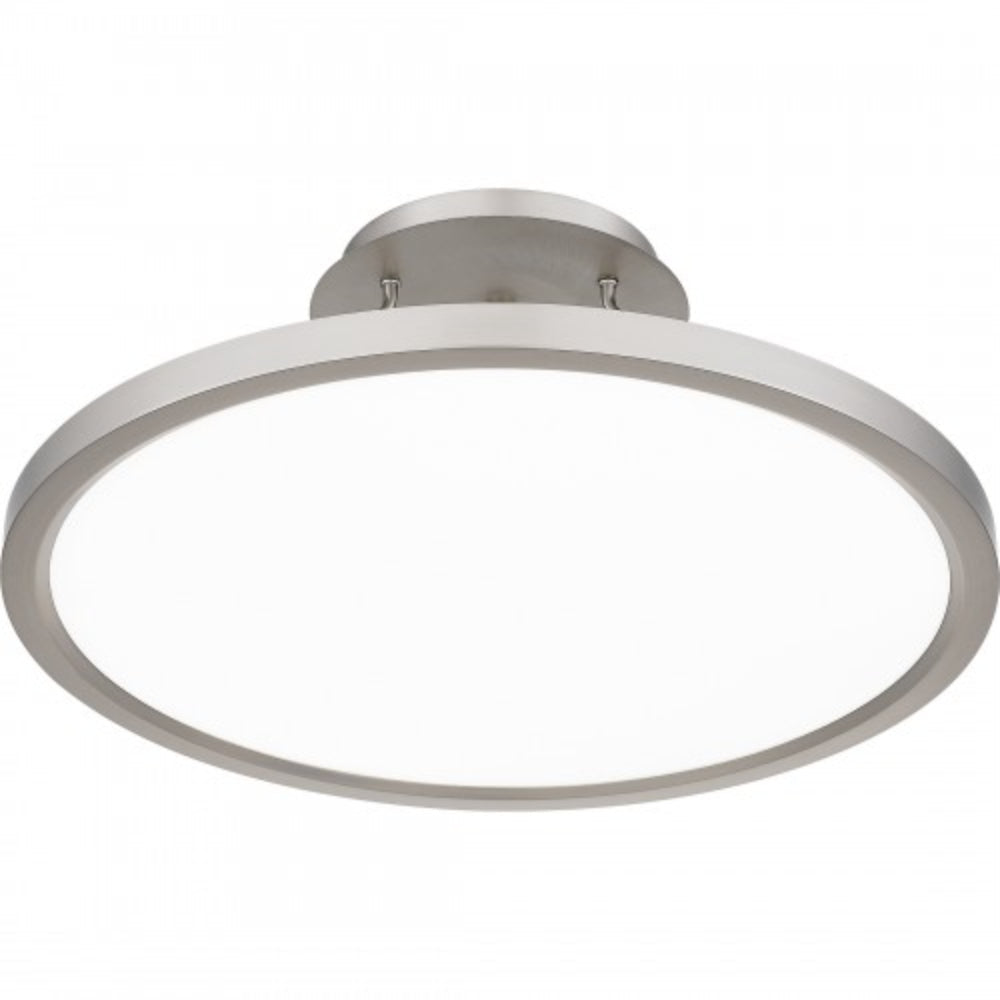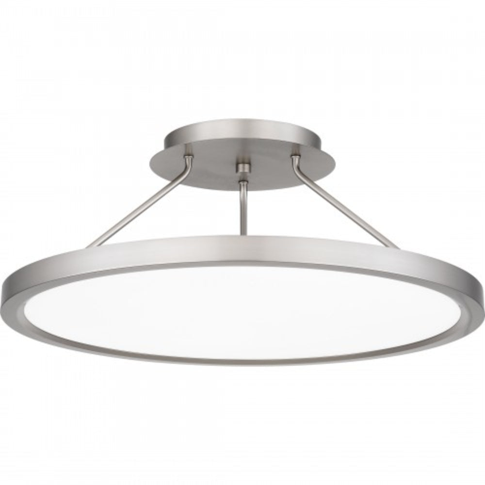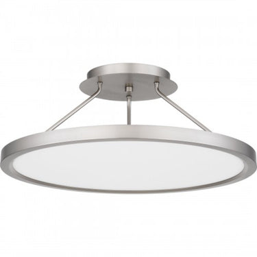 Outskirts is as stylish as it is functional. The contemporary semi-flush mount light is available in a variety of sizes, and in either a brushed nickel or matte black finish. An integrated LED light source shines through a round white acrylic shade, giving off the perfect amount of light for any indoor setting.