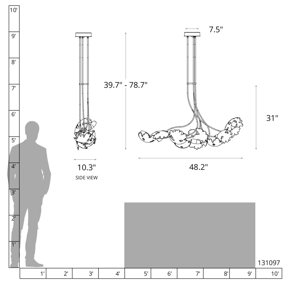 "Unlike other members of the Pangea family, the Pangea 6-Light Linear Pendant features the disintegrating of the sphere, merging the forged fragments and sinuous vining stems with bud-like glass enclosed lights" explains Designer David Martin. A sense of chaotic collision of the Pangea's supercontinental plates is visible through the placement of each hand-forged and shaped steel element along the linear plane of the fixture.
