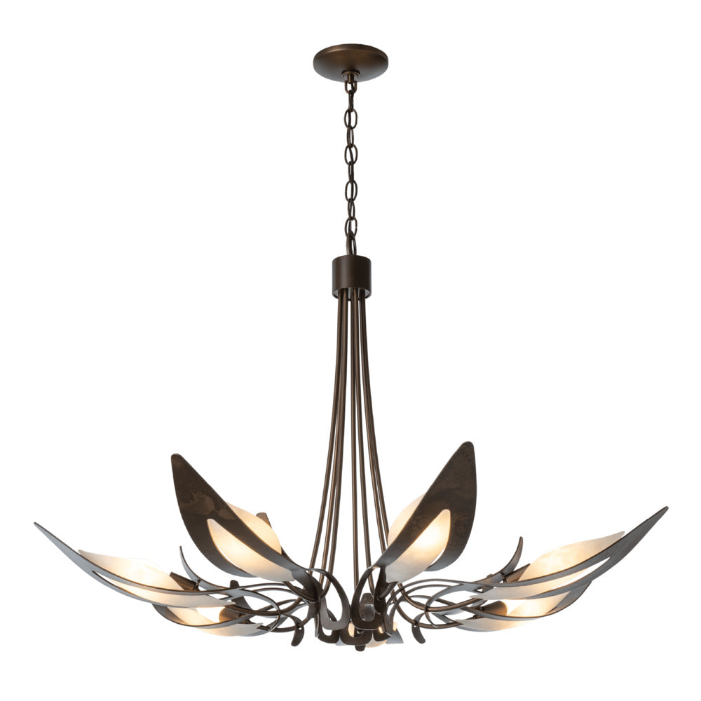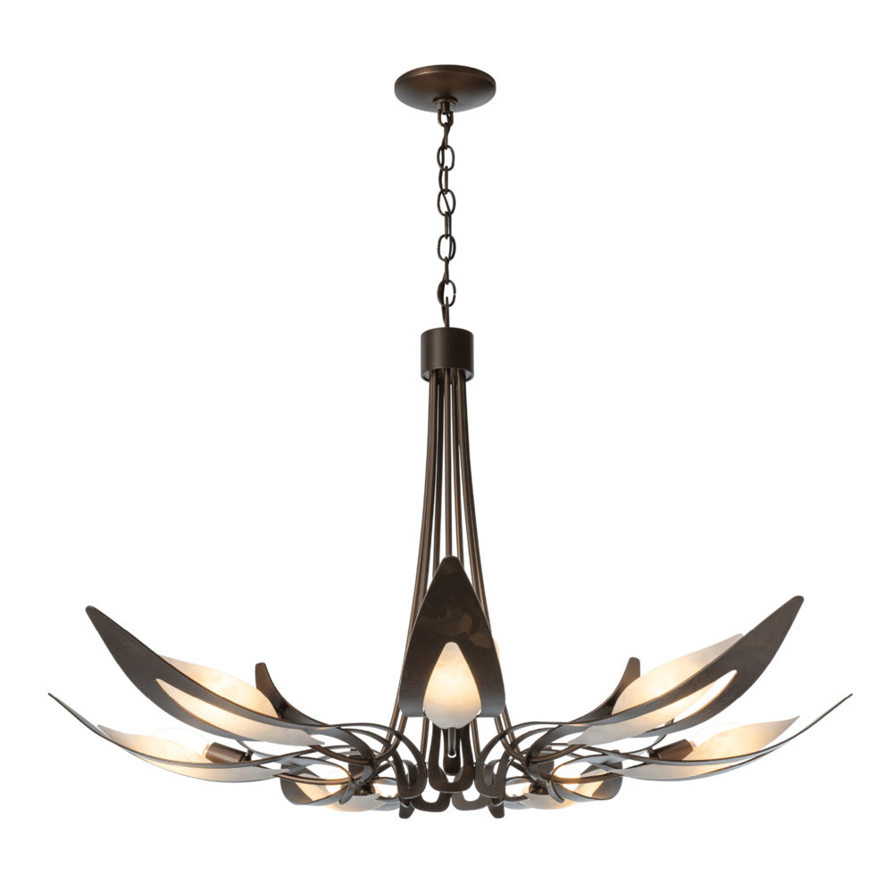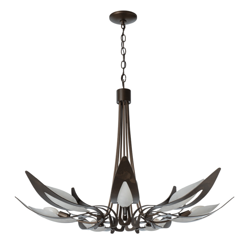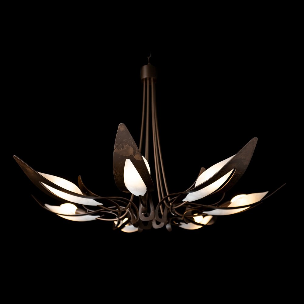Skilled Vermont artisans hand-forge and shape this beautiful lighting fixture, reminiscent of a parasol form. The forged metal texture comes through in each detail. Handmade slumped art glass is nested into each of these seven arms. Parasol designer Jason Hancock recommends using a "milky" candelabra bulb for the perfect effect.