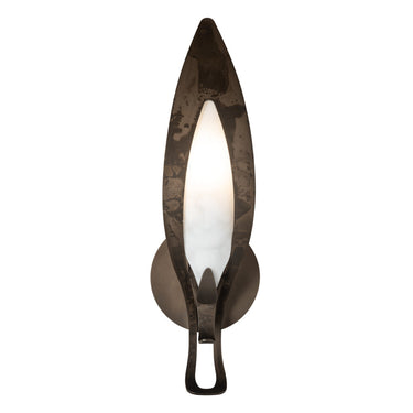 Hand-forged and beautifully shaped by Vermont artisans, the Parasol displays the work of our makers through the texture and personality that steel only achieves in the fires of the forge at more than 1800ºF. A piece of white art glass is nestled in the curve of the sconce's upward reach. According to HF designer Jason Hancock, a "milky" candelabra bulb is an ideal choice.