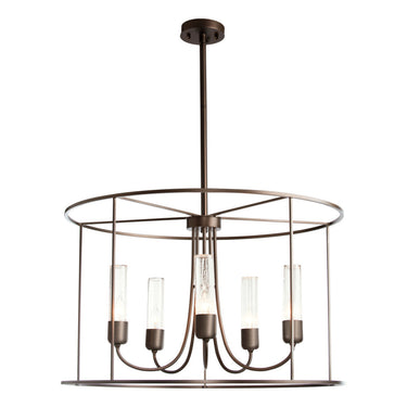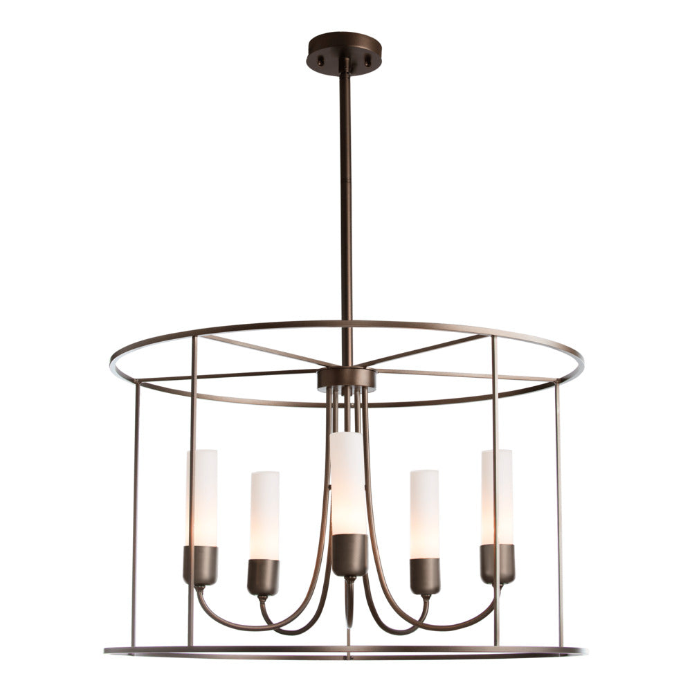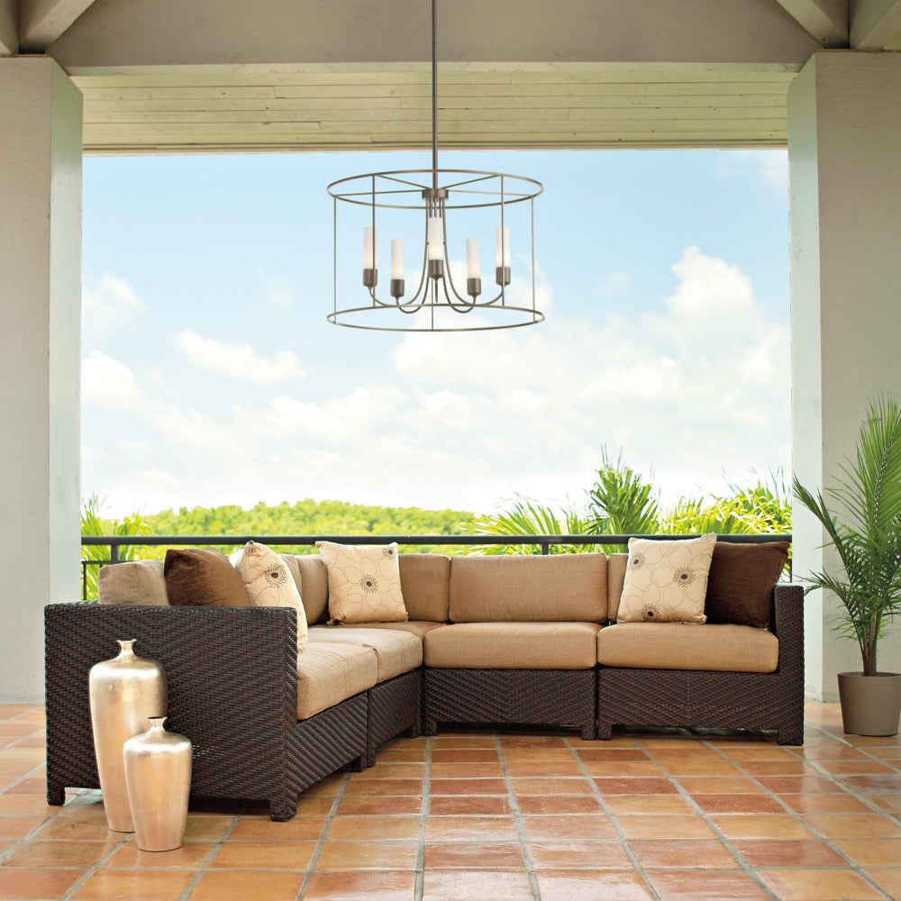 The Portico Drum Outdoor Living Pendant delivers a modern twist on the classic drum shade with its "there, not there" design. The upswept arms hold five candelabra bulbs surrounded by opal or seeded glass tubes. Available in your choice of Coastal Outdoor Finish.