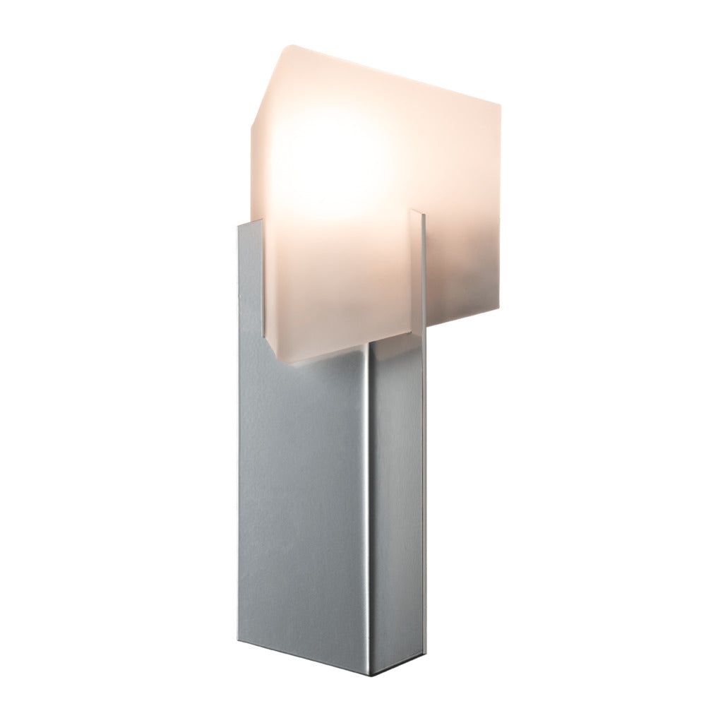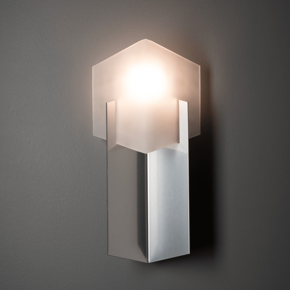 Beauty in a small package. The Prisma 1-Light Bath Sconce features a slumped white art glass combined with a vertical, very geometric metal element. The 90ΒΊ angles of glass and metal are inverted layer-over-layer, with vertical metal pieces that secure the glass. Clean lines and simplicity make this a winner with any style.