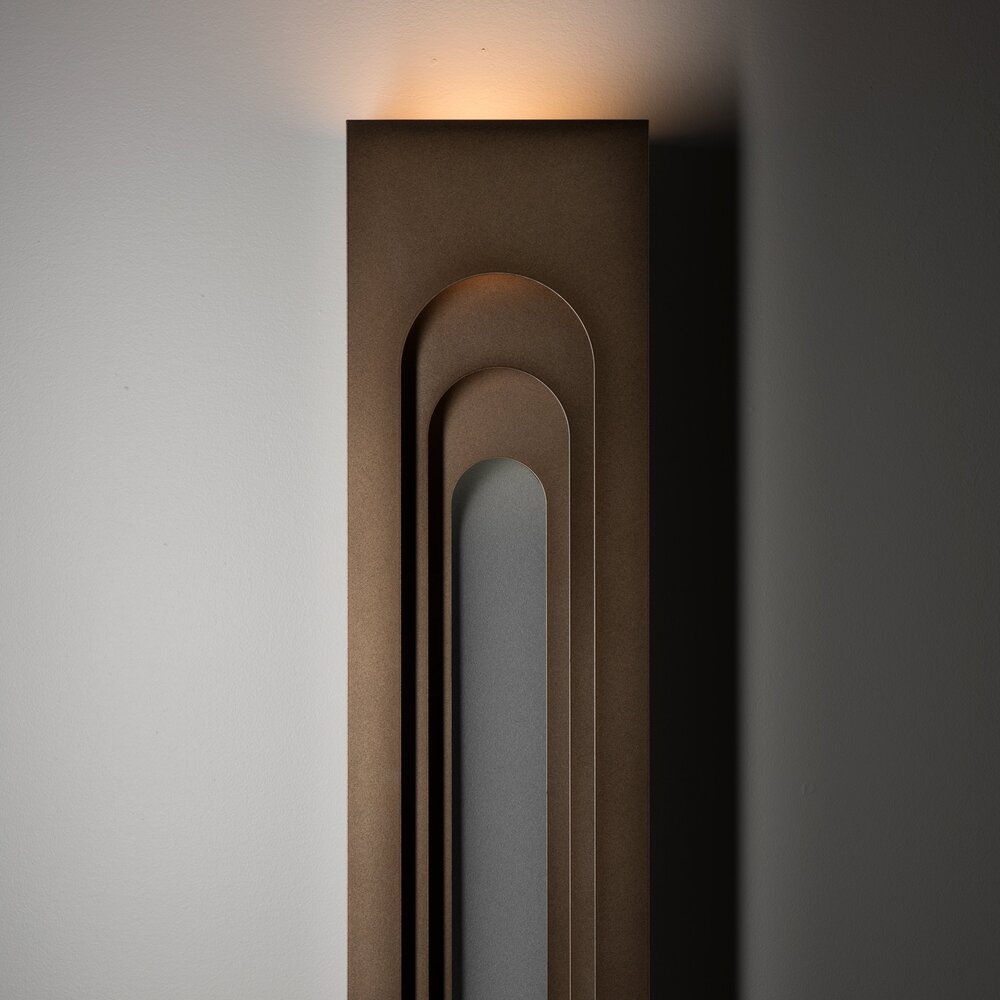 The Procession Arch Large Outdoor Sconce is a creative interpretation of the interior of the Grundtvigs Church in Copenhagen that our designer visited while studying architecture. The varying depth of field created by a trio of aluminum arches provides a balanced aesthetic that's both modern and timeless. Made for the outdoors, yet elegant enough for indoor use, as well. Part of ART + ALCHEMY by Hubbardton Forge.