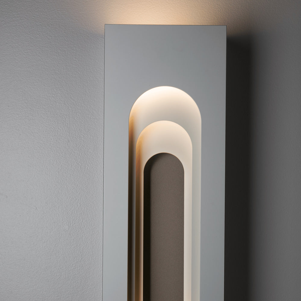 Inspired by a visit to the Grundtvigs Church in Copenhagen, the Procession Arch Small Outdoor Sconce takes the idea of spatial progression, utilizing forced perspective to achieve its timeless aesthetic. The original Gothic arch was transformed into a Roman arch in this aluminum wall-mounted sconce. Part of ART + ALCHEMY by Hubbardton Forge. Designed for the outdoors, yet beautiful enough for the indoors, as well.