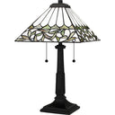 The Galahad table lamp is as pretty as it is functional. The classic design features a matte black finish and a handcrafted, white Tiffany glass shade with a multicolored floral motif. Each piece of glass is hand assembled, creating a one-of-a-kind statement piece perfect for a bedroom, kitchen, or home office.