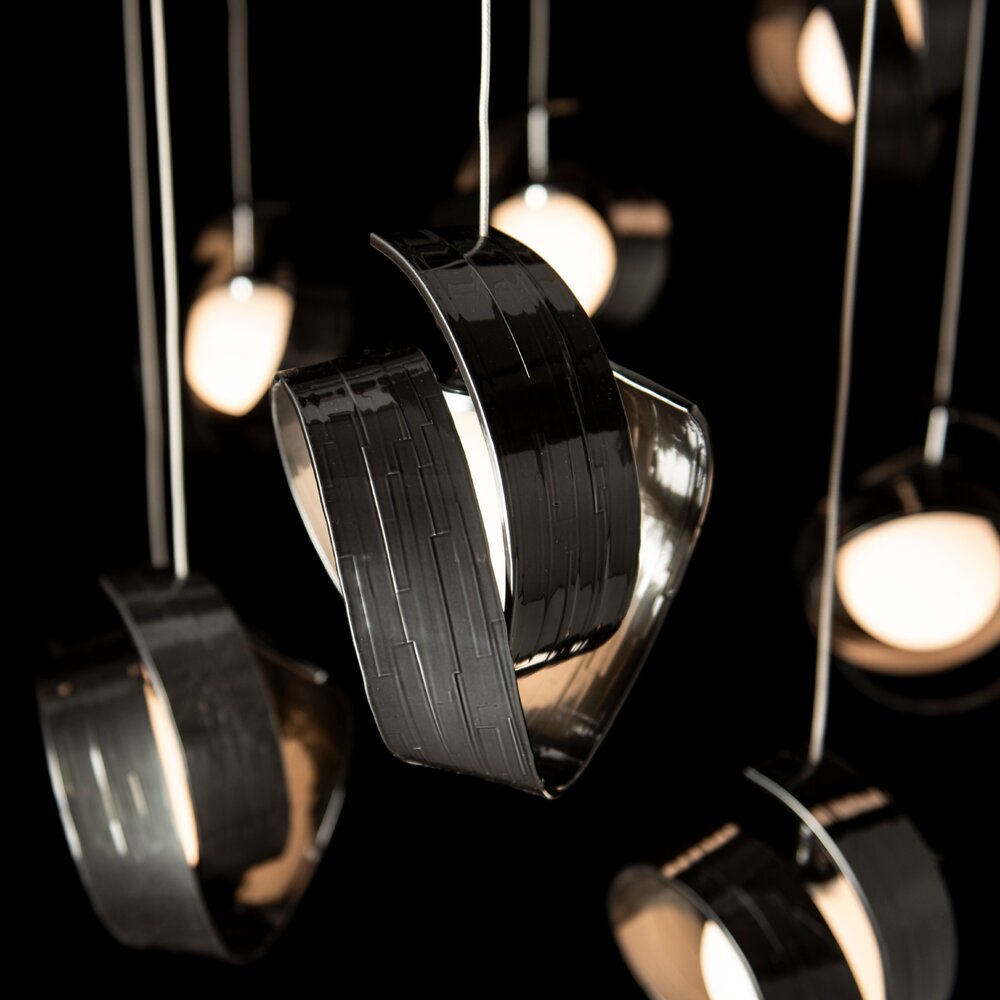 Each Riza curl is hammered and shaped to create this stunning display. The mobile platform minimizes the canopy, while the delicate metal tubes guide the cables providing not just great breadth, but also a highly-adjustable fixture. Riza elements are artfully balanced for a unique feeling of both depth and whimsy.
