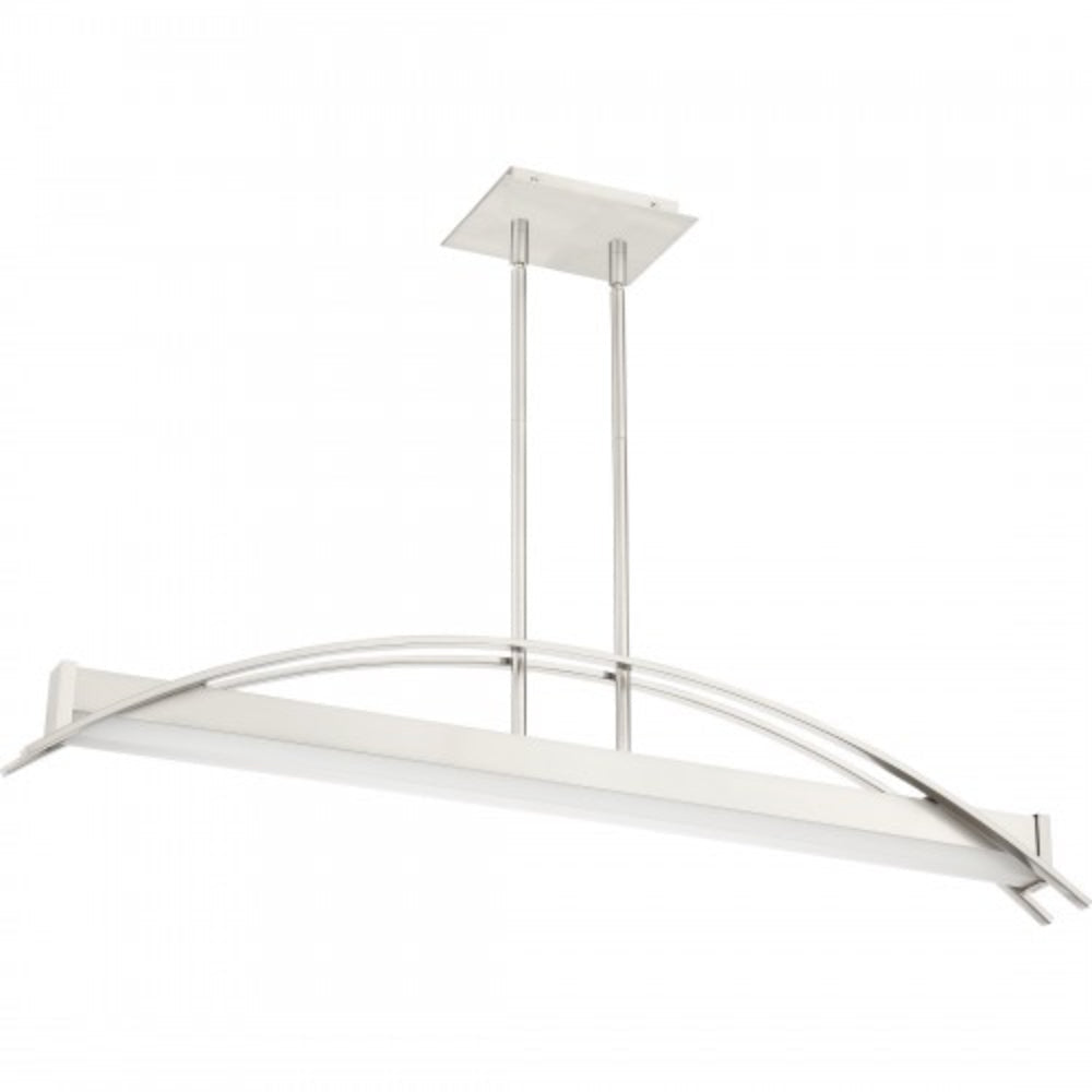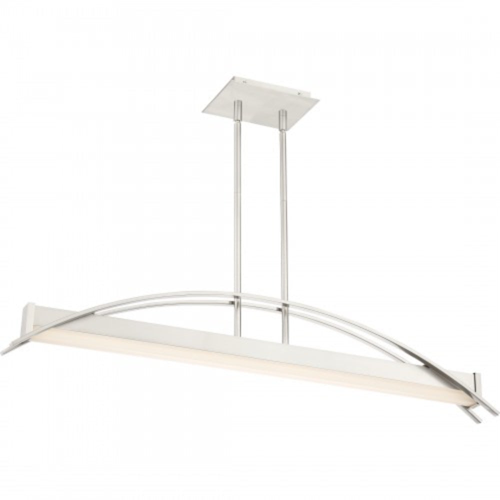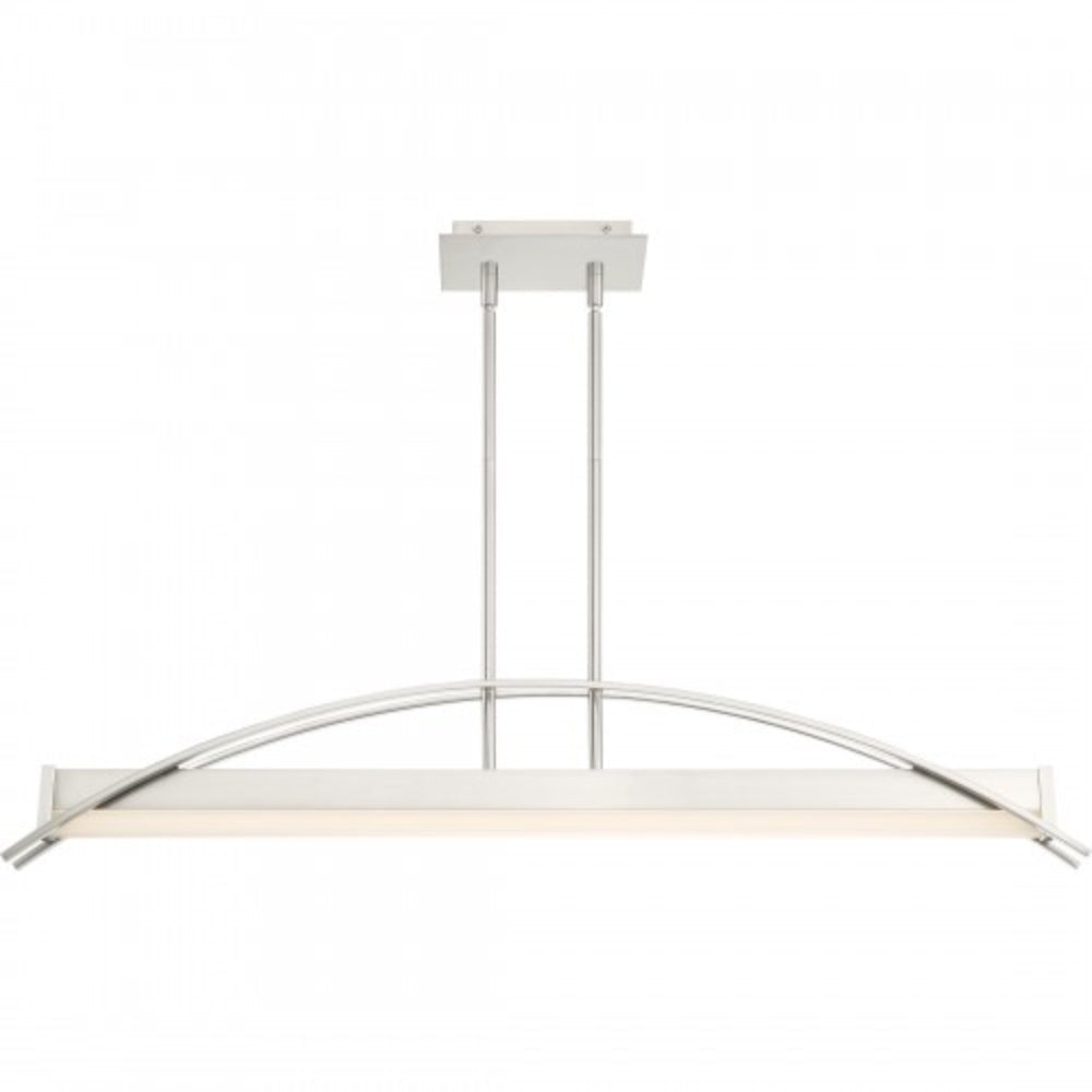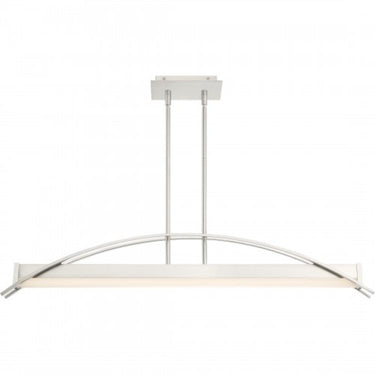 Making a dramatic statement with its modern bridge-like design, the Sabre Island Light for Platinum by Quoizel is expertly stylish. Two flat arcing beams span the length of the fixture and add depth to the rectangular shape of the body. The integrated LED light source is housed underneath a white acrylic shade. The brushed nickel finish is continued on the rods and canopy culminating in a completed work of art.