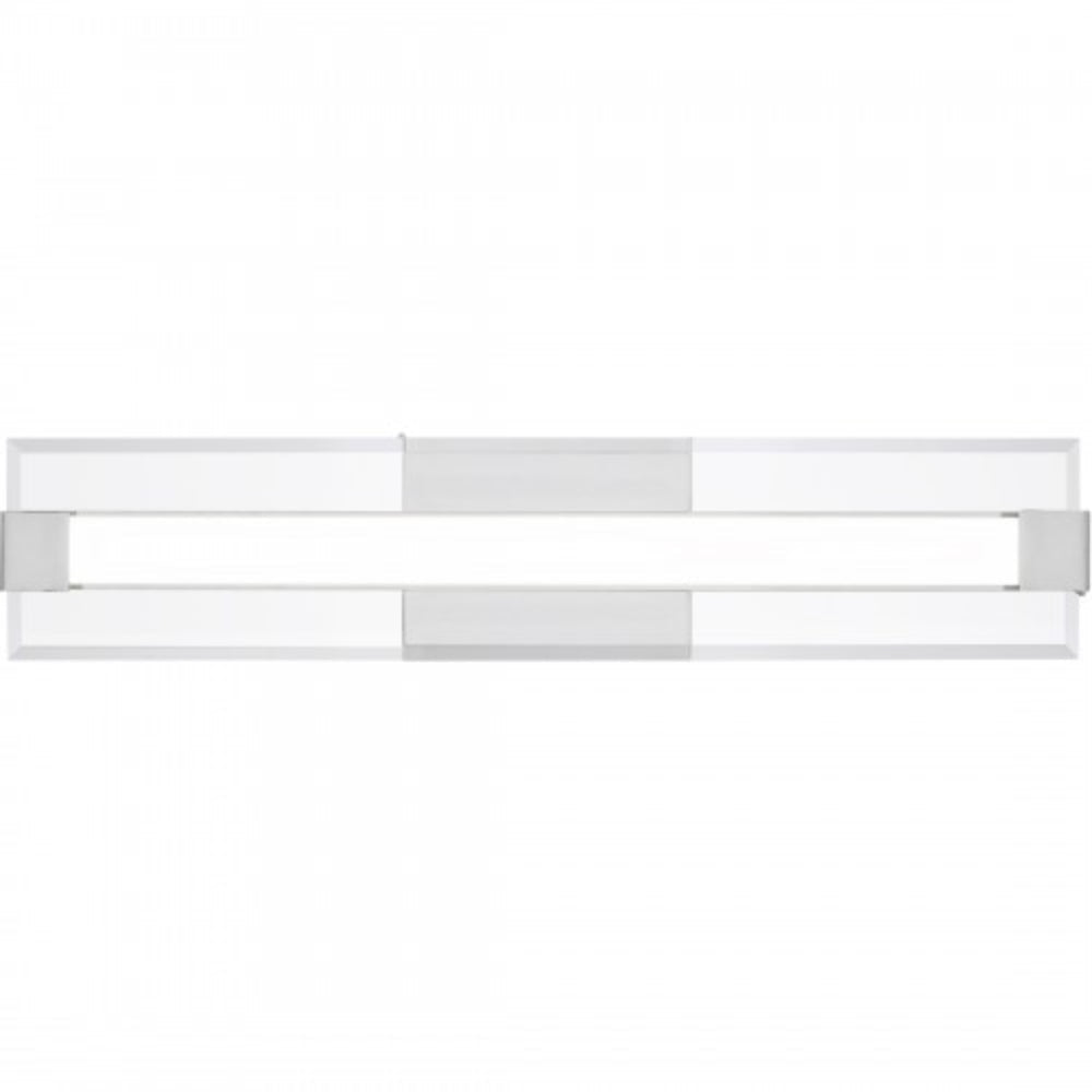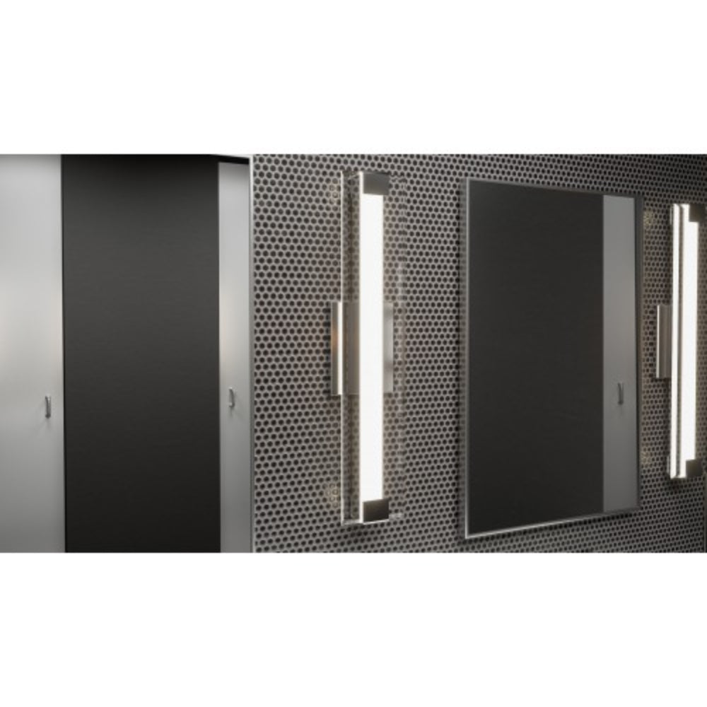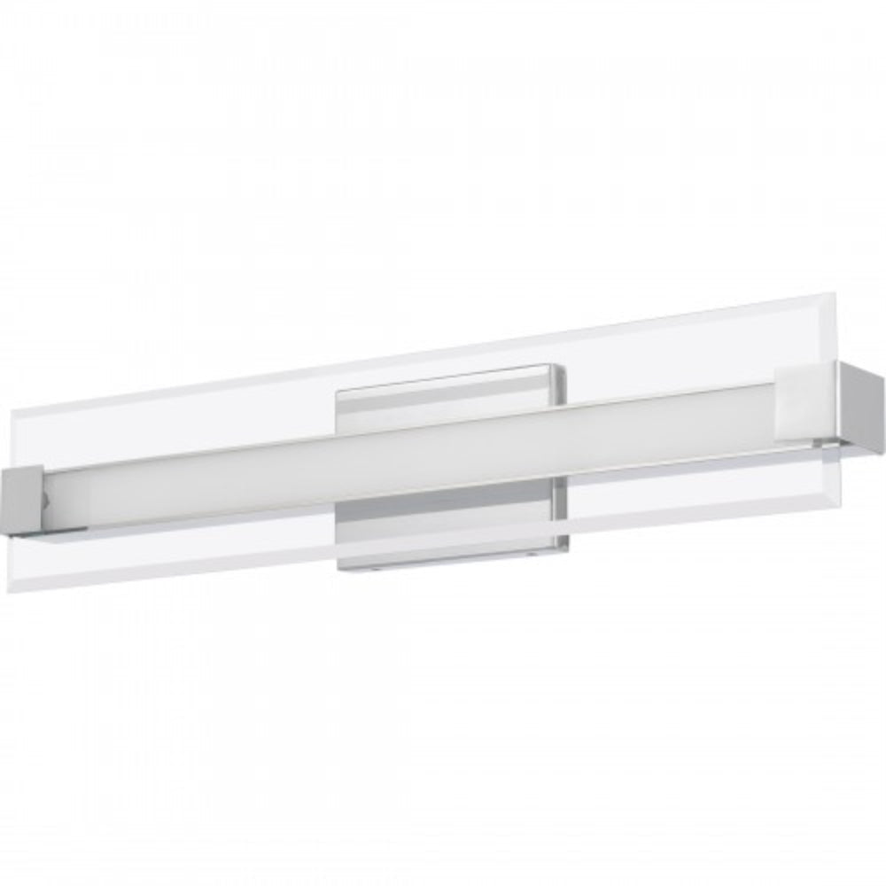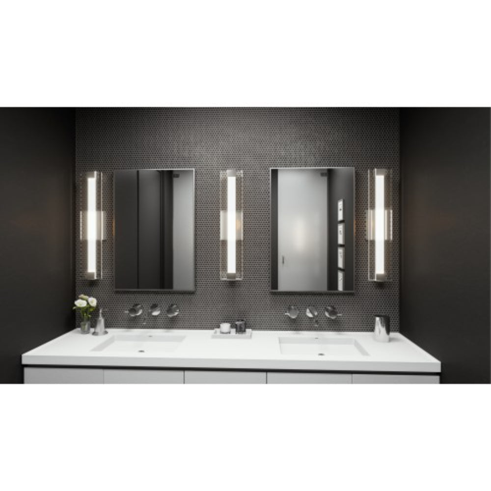 The Salon collection is modern minimalism at its finest. Clear beveled glass floats in the foreground, while a sleek integrated LED radiates from behind. The layered components are secured by discreet end brackets to a glossy backplate which are both finished in polished chrome for a contemporary shine.