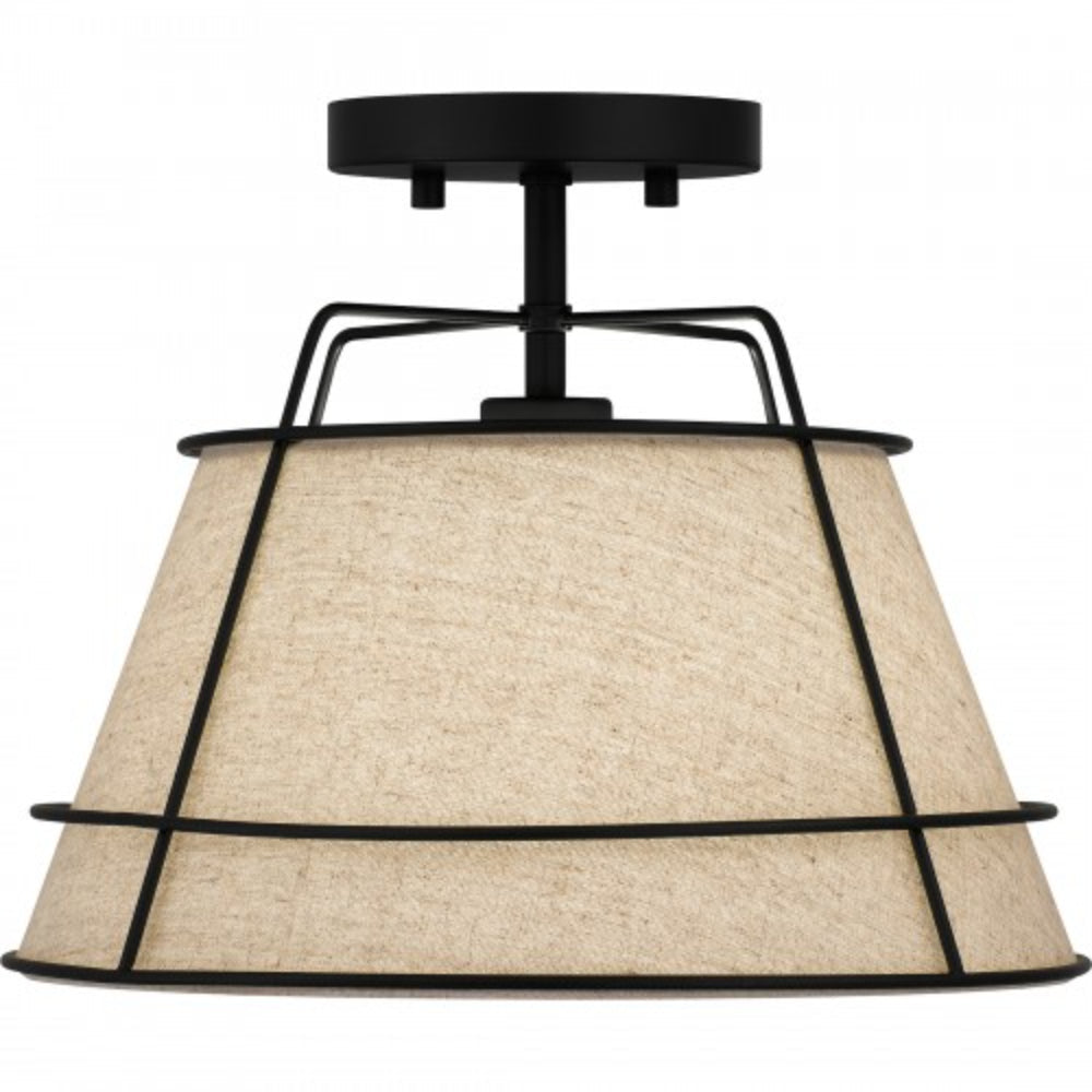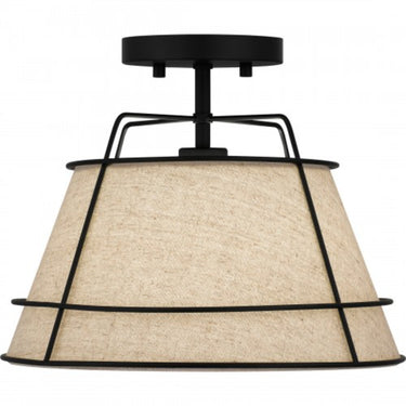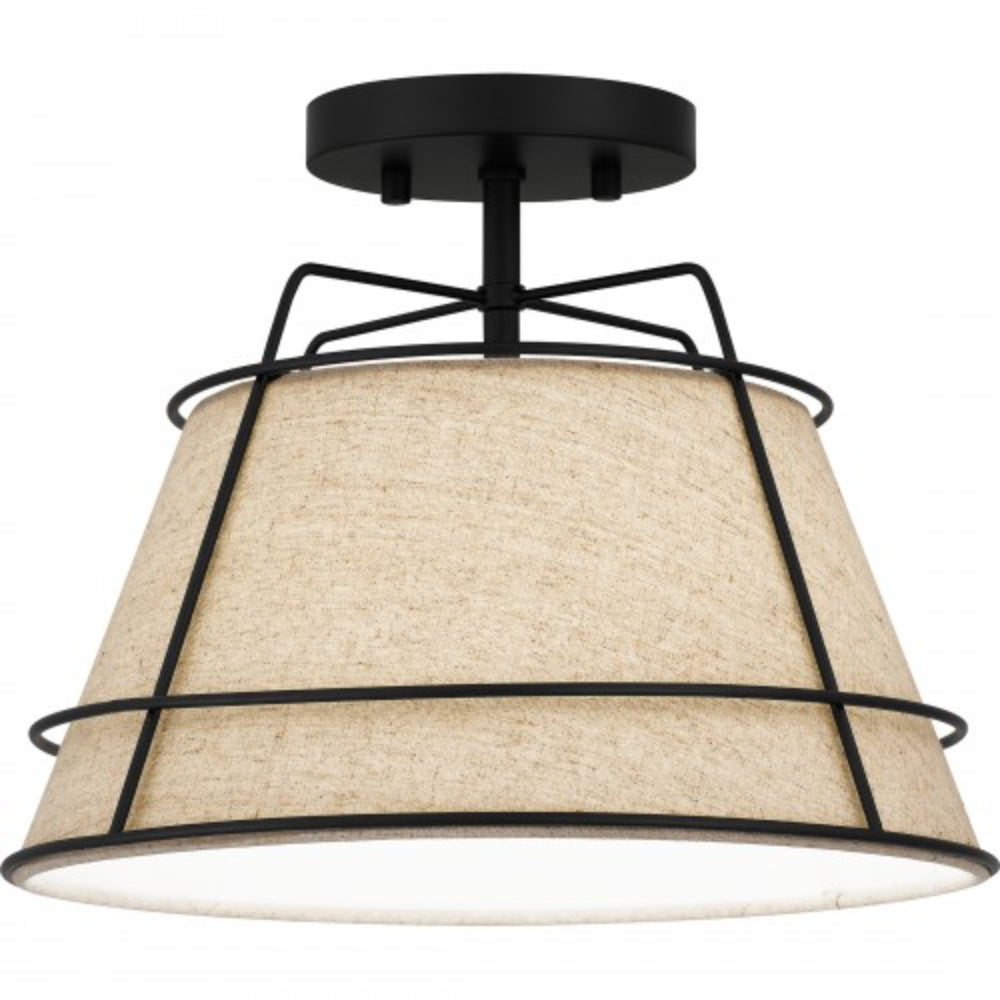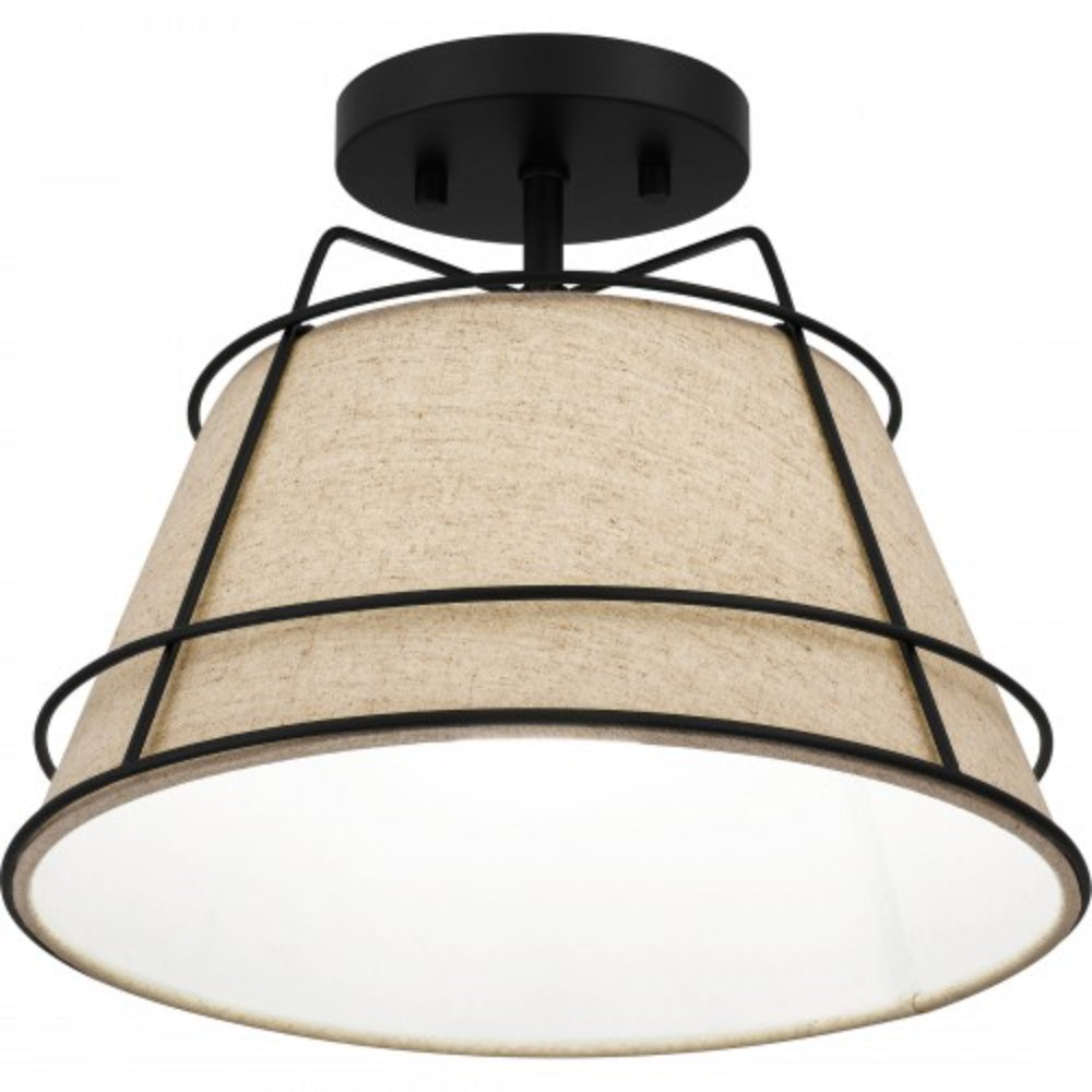The Burbidge semi-flush mount light illuminates soft texture thanks to a white fabric shade. Sleek matte black lines envelop the shade, adding an element of industrial style. This design is ideal for contemporary and transitional spaces, infusing a subtle dash of warmth and whimsy.