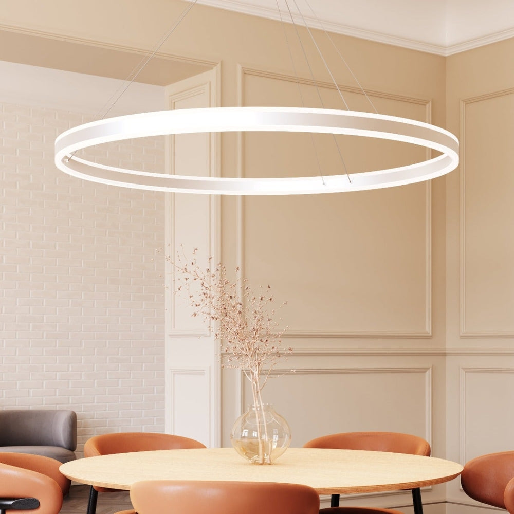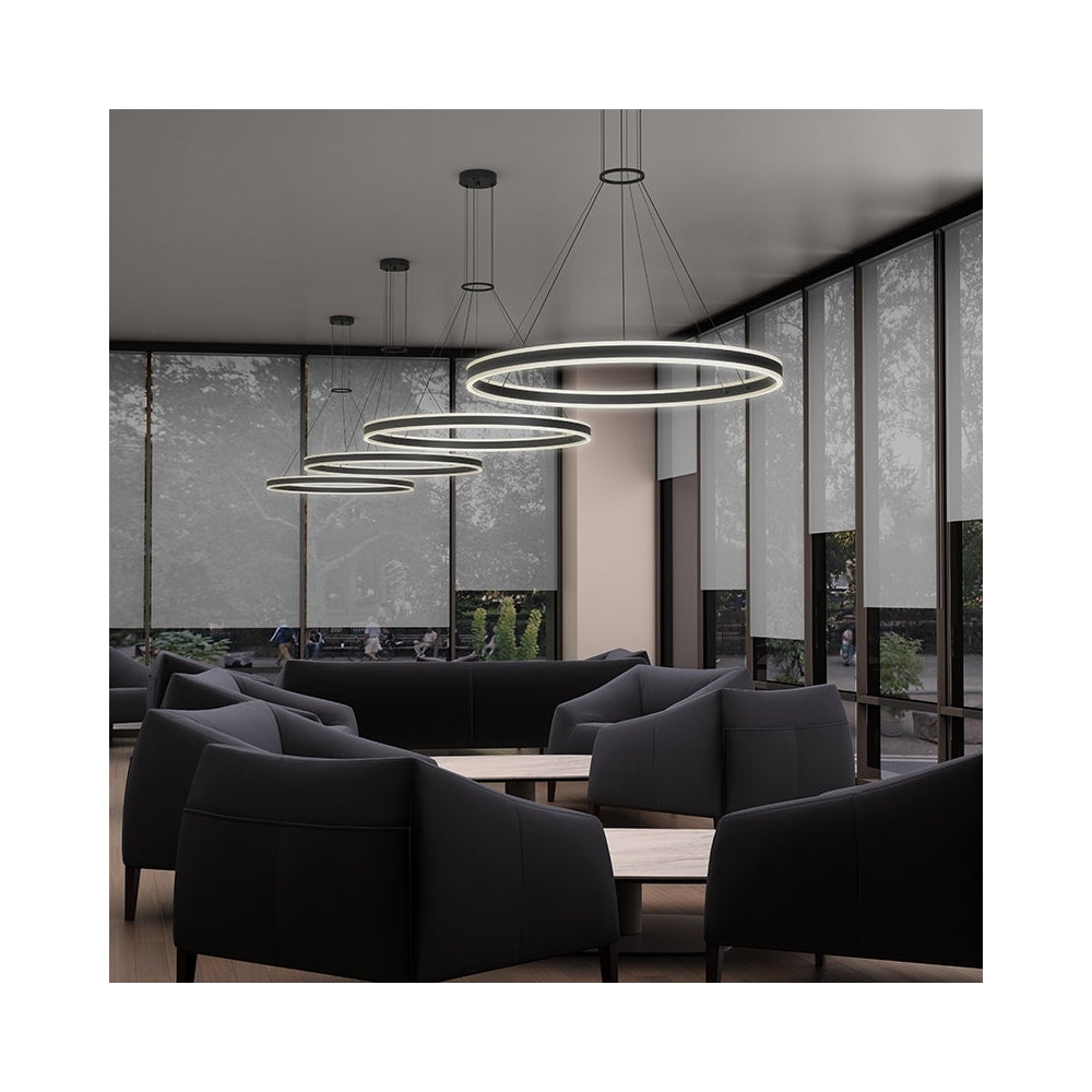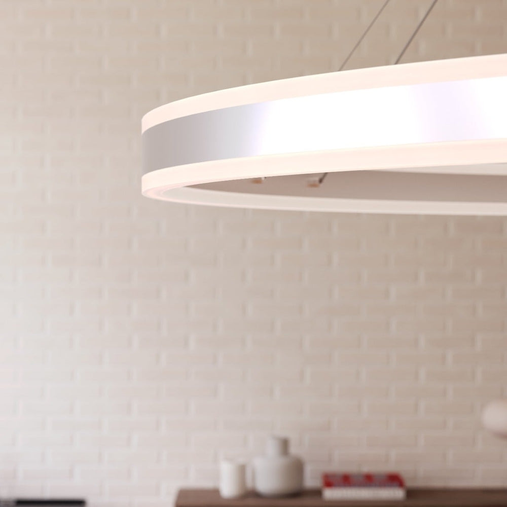 Double Corona introduces bidirectional lighting symmetry to the circular profile of Corona, a Sonneman classic. The warm glow of solid cast, frosted acrylic rings radiates LED illumination in both up and down directions, combining balance with geometric perfection.