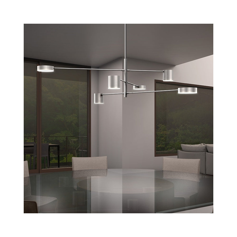 Flat disc and deep cylindrical forms, of different visual weights in juxtaposition to each other, are counterbalanced on offset slender arms in a rotating system of mass. Dramatically powerful in its simplicity, Counterpoint delivers bright LED luminance downward, with a subtly lit edge from the solid acrylic lenses of its cylindrical heads.