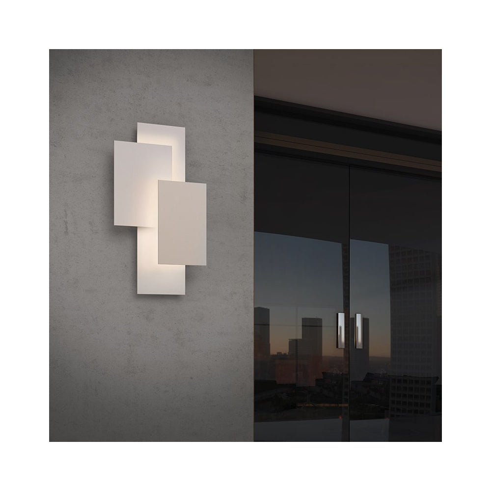 Shielded LED illumination reflects dramatically off the slightly hidden, offset surfaces of this layered panel composition, at home inside or out.