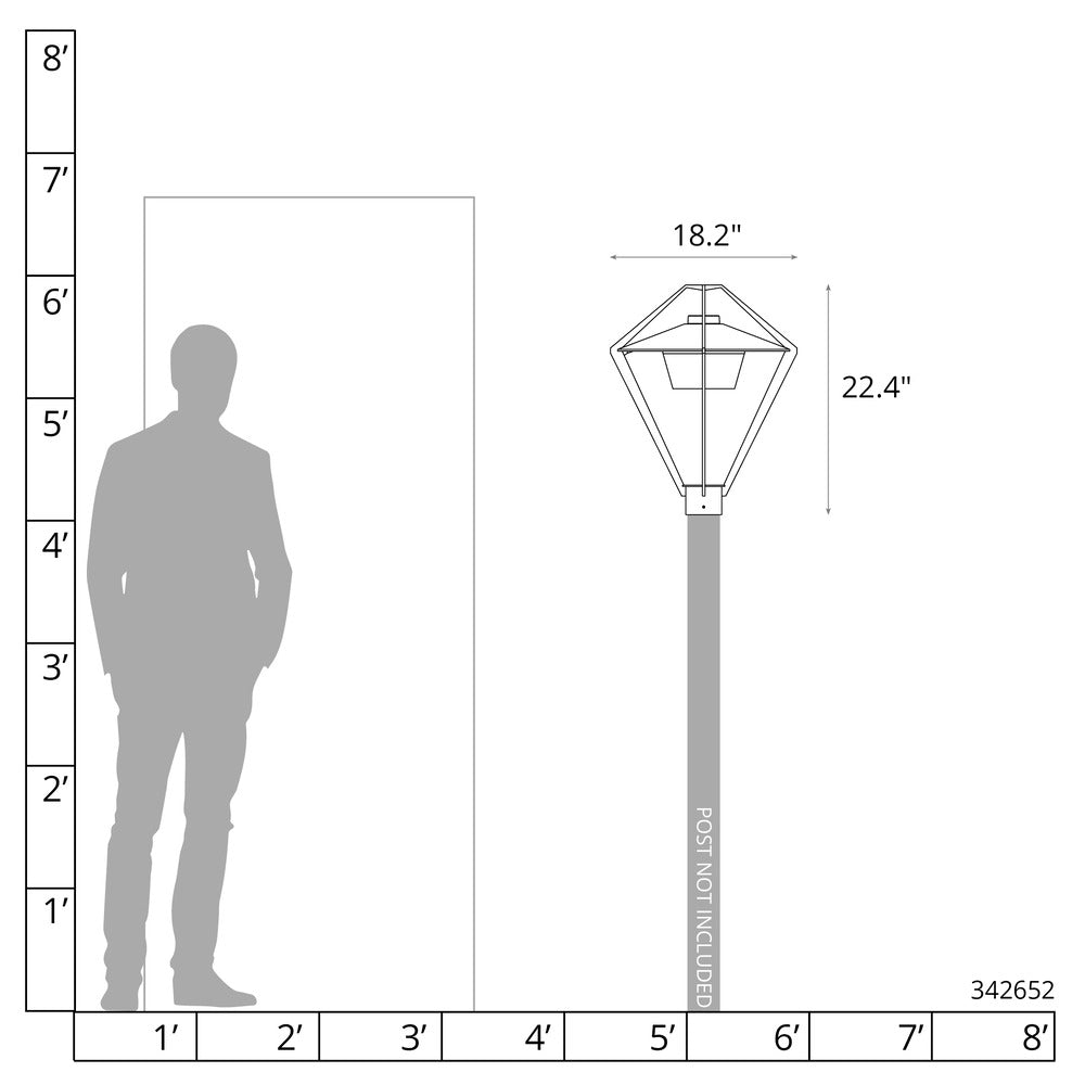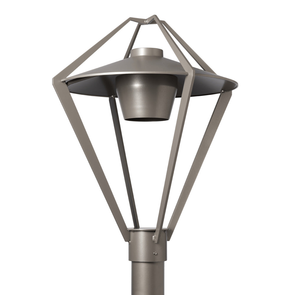 Enclosed in a stunning metal exoskeleton for a minimalist contemporary take on a classic lantern design, this Dark Sky Friendly post light offers a sophisticated welcome to visitors. Its airy, open "cage" contains a short metal cylinder from which the light emanates. By focusing the light downward, light pollution is reduced and the effective lighting helps to increase path safety.