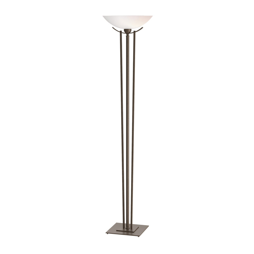 Taking a cue from the tall ornamental stands for candlesticks from long ago, our Torchiere rises to the height of elegance with two rods of steel escorting the steel tube up to the glass bowl.